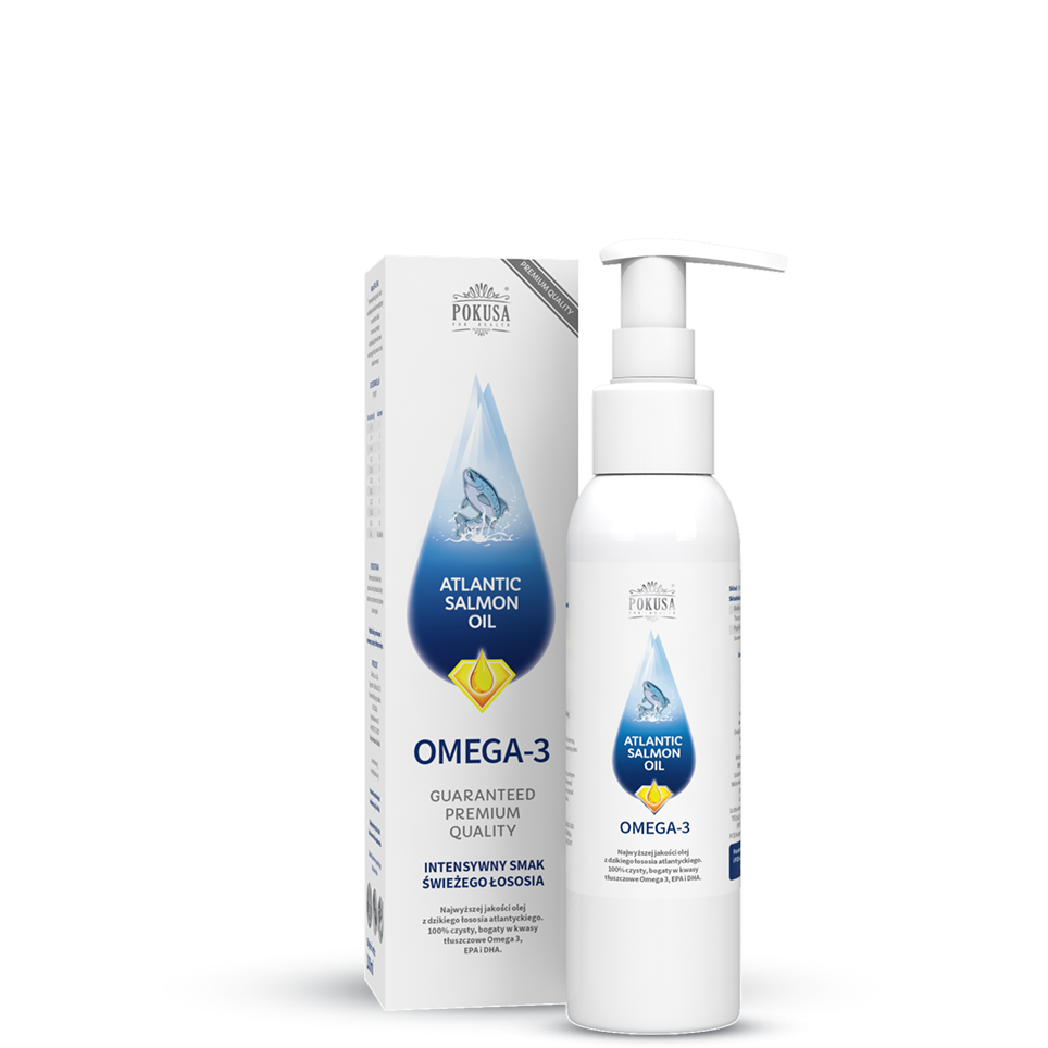 - Wysokiej jakości olej z dzikiego łososia atlantyckiego dla psa i kota na piękną i zdrową sierść