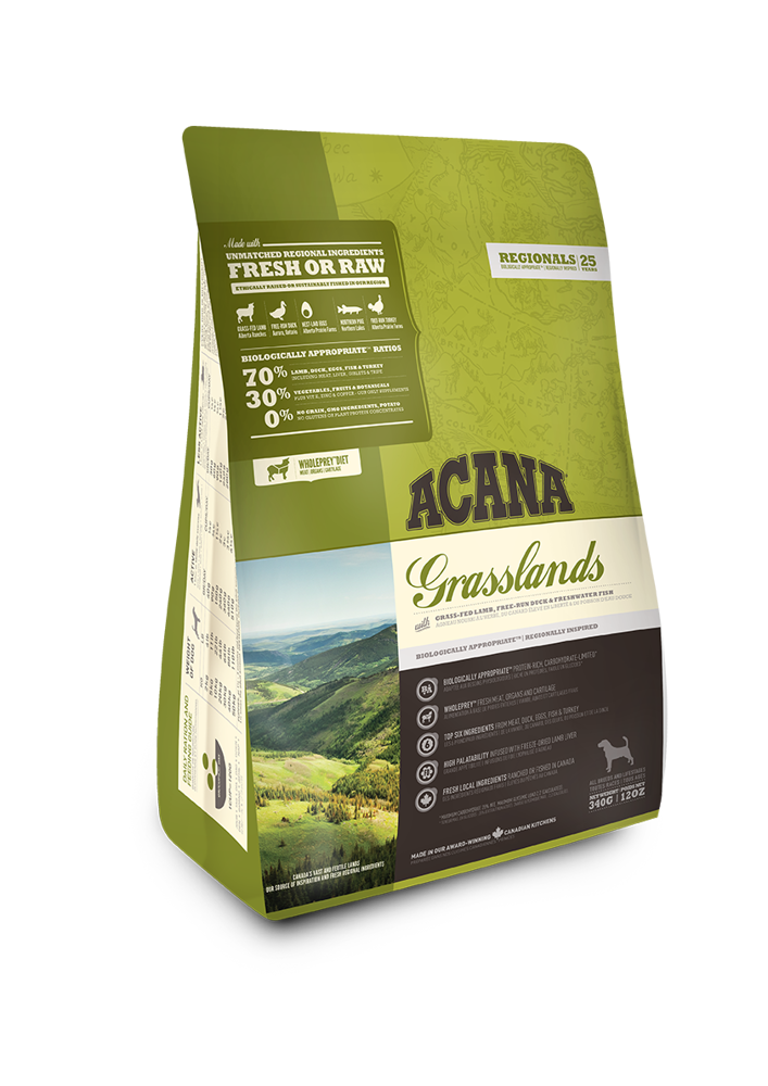 ACANA REGIONALS Grasslands zawiera jagnięcinę, kaczkę z wolnego wybiegu, jaja ściółkowe i ryby - wszystko w proporcjach WholePrey™ by odżywiać w sposób naturalny, bez sztucznych dodatków. Składniki dostarczane są świeże lub surowe z regionu Alberty. ACANA REGIONALS Grasslands ma ograniczoną zawartość węglowodanów, a przepełniona jest białkiem zwierzęcym, by zapewnić psu szczytową formę.