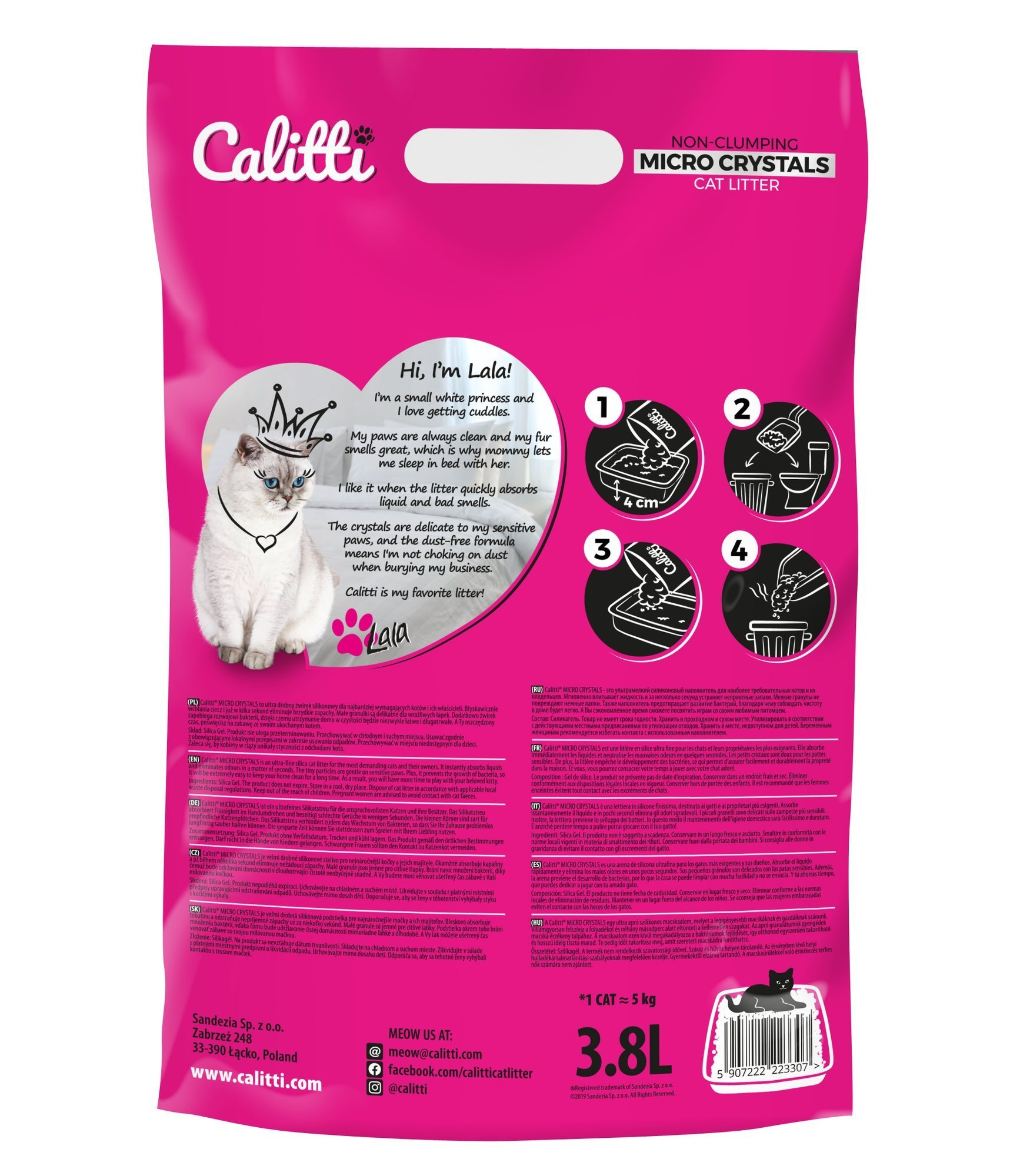 Calitti® MICRO CRYSTALS to ultra drobny żwirek silikonowy dla najbardziej wymagających kotów i ich właścicieli. Błyskawicznie wchłania ciecz i już w kilka sekund eliminuje brzydkie zapachy. Małe granulki są delikatne dla wrażliwych łapek. Dodatkowo żwirek zapobiega rozwojowi bakterii, dzięki czemu utrzymanie domu w czystości będzie niezwykle łatwe i długotrwałe. A Ty oszczędzony czas, poświęcisz na zabawę ze swoim ukochanym kotem.