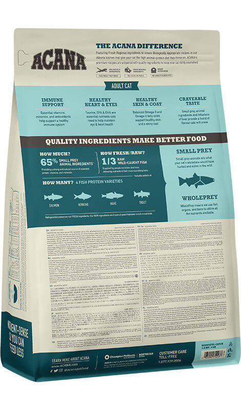 - ACANA Bountiful Catch zawiera wysokiej jakości składniki rybne: poławianych w naturalnym środowisku łososia, śledzi i pstrąga tęczowego.