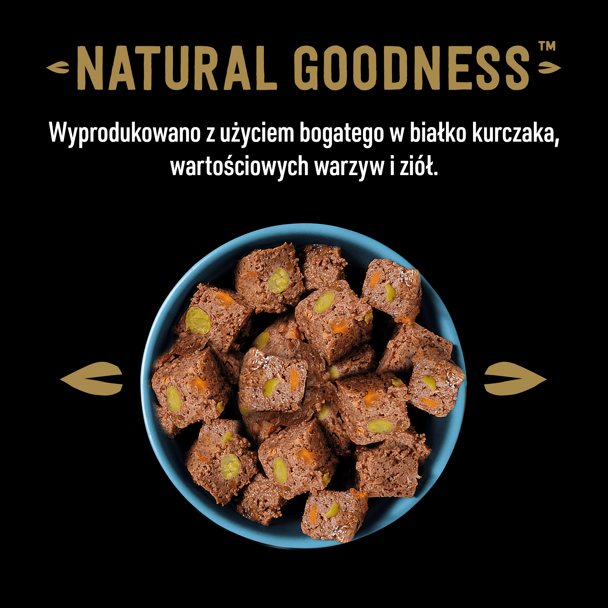 Jedzenie dla psa Cesar® Natural Goodness Bogaty w Kurczaka zostało przygotowane według starannie dobranej receptury, która zapewnia psom wszystko, czego potrzebują każdego dnia. To jedzenie idealne na codzienny, świeży i pyszny posiłek. Możesz je podawać z karmą suchą lub jako samodzielne danie. W jego opracowaniu brali udział dietetycy i lekarze weterynarii z Instytutu Nauki o Zwierzętach WALTHAM™. Jest bogaty w kurczaka, przybrany warzywami i ziołami – kurczak to źródło kwasów tłuszczowych omega-6, batat to źródło potasu, a ekstrakt z żurawiny to źródło przeciwutleniaczy. Karma dla psa Cesar® Natural Goodness została przygotowywana tak, aby zachować naturalne wartości odżywcze i pyszny smak.