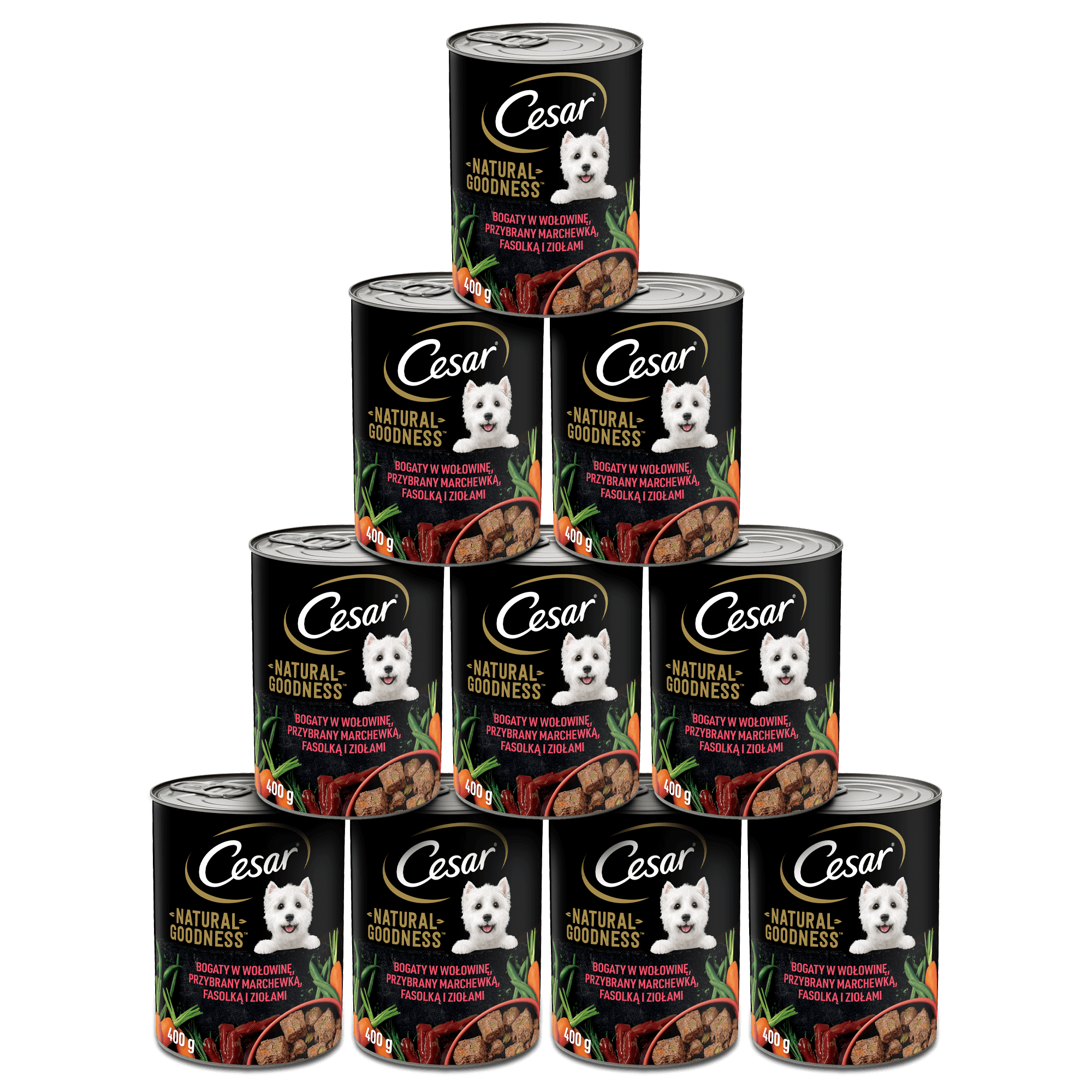 CESAR puszka 12x400g - mokra karma pełnoporcjowa dla dorosłych psów bogata w wołowinę, przybrana marchewką, fasolką i ziołami