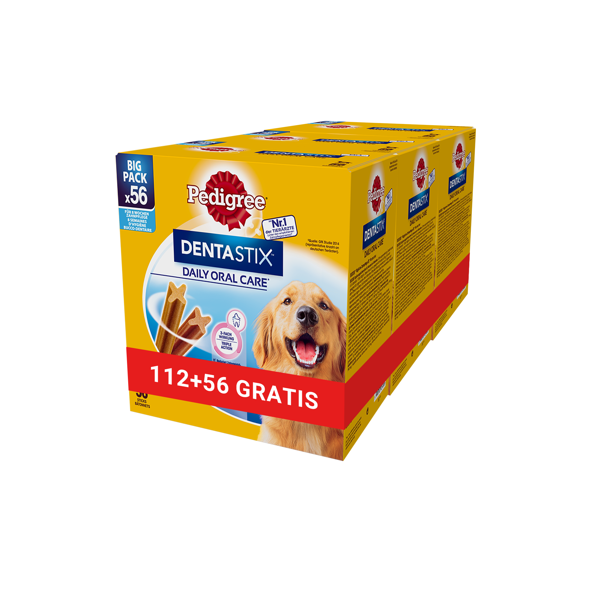 PEDIGREE® DentaStix Codzienna Pielęgnacja Jamy Ustnej to pokarm uzupełniający dla psów powyżej 4. miesiąca życia. Ten rozmiar przysmaku przeznaczony jest wyłącznie dla psów o masie ciała ponad 25 kg. PEDIGREE® Dentastix działa pozytywnie na zęby i dziąsła psa – oczyszcza i redukuje tworzenie kamienia nazębnego. Z PEDIGREE® DentaStix skutecznie troszczysz się o zdrowie i witalność swojego psa.