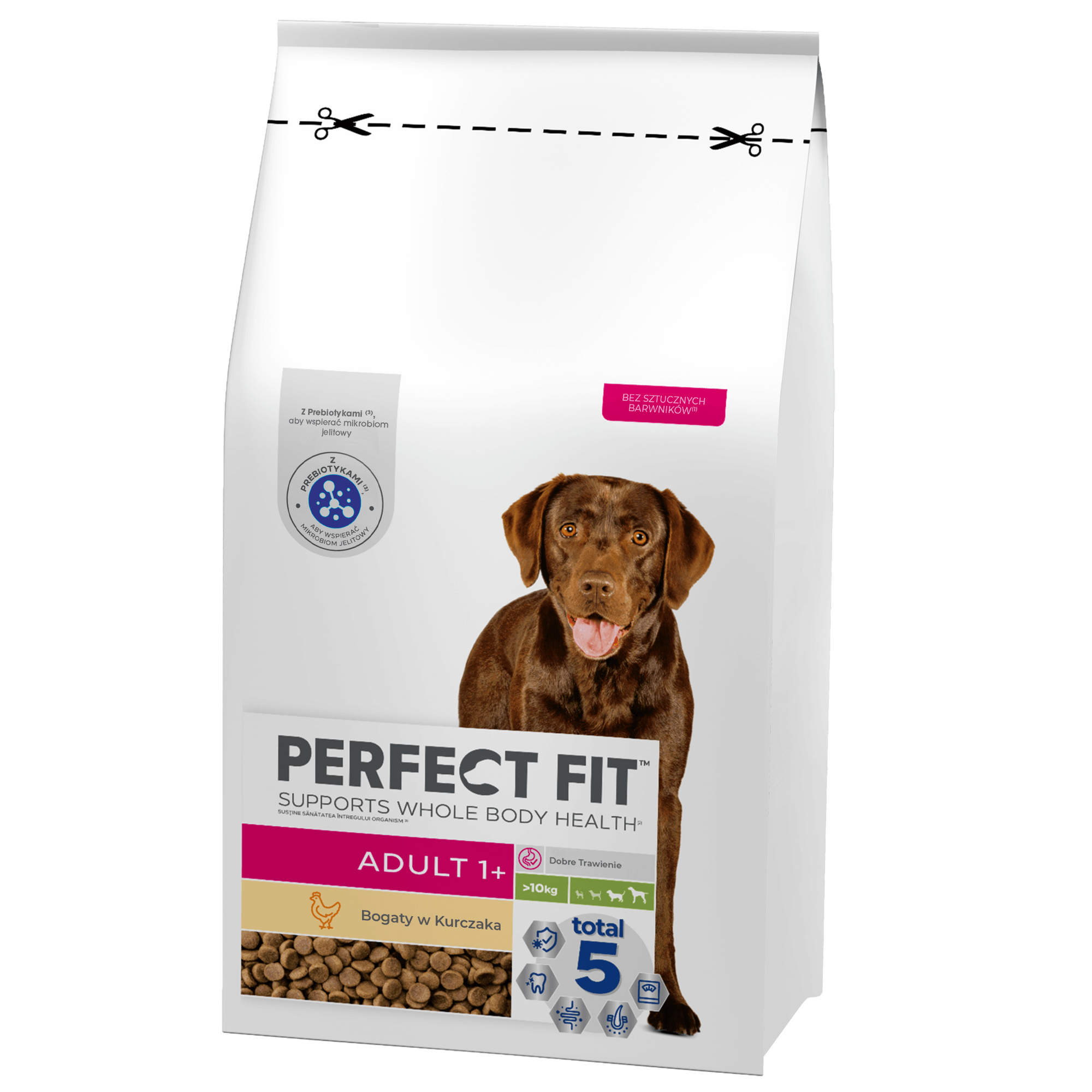 Pyszny pokarm Perfect Fit™ Adult 1+ bogaty w kurczaka zawiera wyjątkową formułę Total 5, która wspiera 5 najważniejszych obszarów zdrowia dorosłego pupila: wspomaga silny układ odpornościowy, zdrowie jamy ustnej, zdrowe trawienie, zdrową skórę i sierść oraz utrzymanie optymalnej kondycji i masy ciała. Receptura Perfect Fit™ Adult 1+ została opracowana we współpracy z lekarzami weterynarii oraz specjalistami ds. żywienia z Instytutu Nauki o Zwierzętach WALTHAM™, aby dostarczyć niezbędne składniki odżywcze dorosłym psom. Tak jak inne warianty, również pokarm Perfect Fit™ Adult 1+ bogaty w kurczaka dostarcza dodatkowe korzyści: wspomaga dobre trawienie dzięki optymalnej mieszance włókien pokarmowych oraz zawiera prebiotyki, aby dbać o mikrobiom jelitowy. Wybierając to pożywienie dla swojego pupila dużej rasy, masz pewność, że unikalna formuła Perfect Fit™ wspiera zdrowie całego organizmu Twojego psa oraz zapewnia mu dodatkowe korzyści zdrowotne, które są specjalnie dopasowane do jego wieku i indywidulanych wymagań.