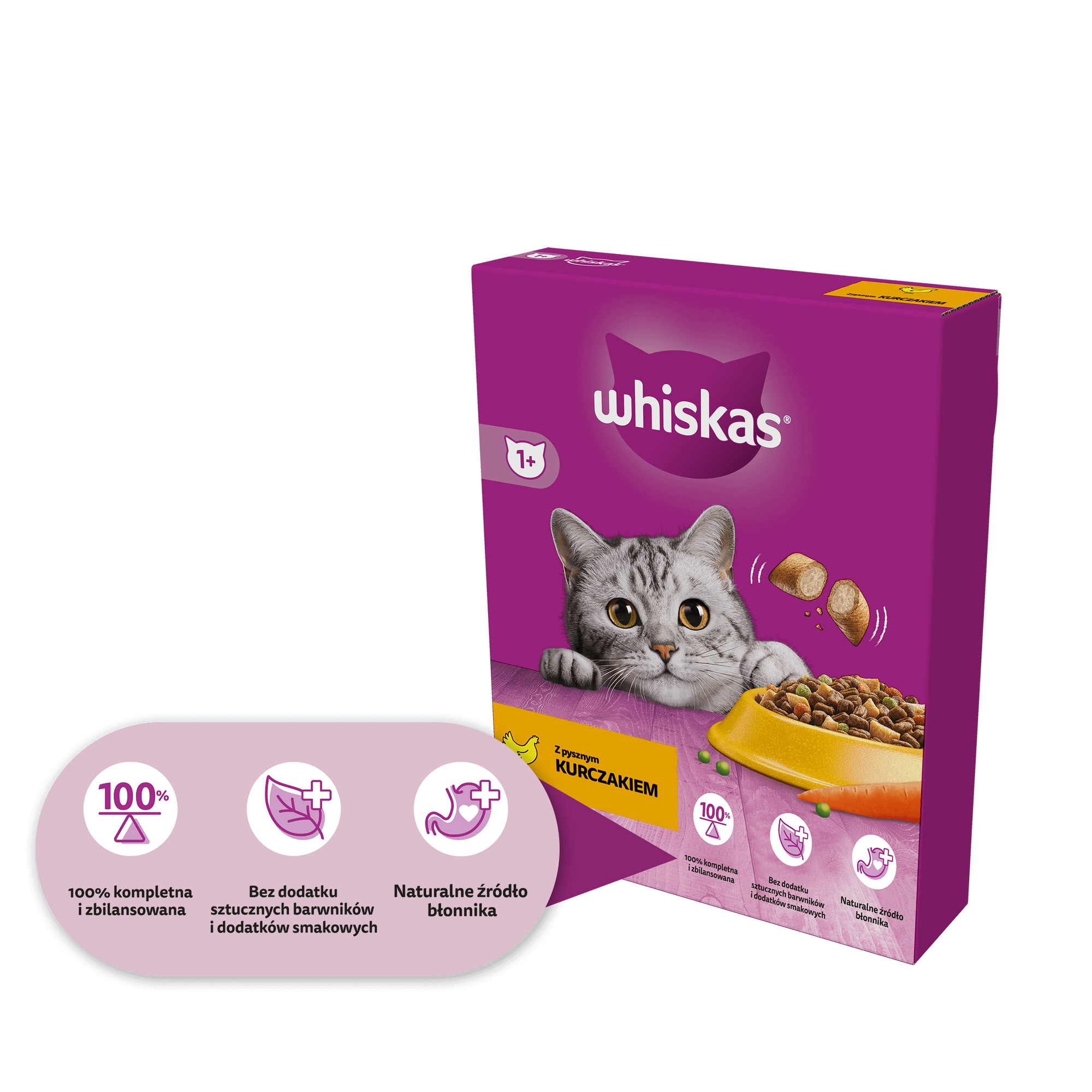 Whiskas z pysznym kurczakiem to pełnoporcjowy suchy pokarm z pasztecikami kruchymi na zewnątrz i z delikatnym nadzieniem w środku, które koty uwielbiają. Granulki z wysokiej jakości białkiem są starannie opracowane, aby dać Twojemu kociemu przyjacielowi wszystko, czego potrzebuje do mruczenia. Kompletna i zbilansowana receptura ze zdrowymi i apetycznymi warzywami - marchewką i groszkiem - zapewnia Twojemu kotu perfekcyjną dawkę wszystkich niezbędnych składników odżywczych - w tym witamin i minerałów. Dzięki karmie Whiskas, która jest przygotowana z wysokiej jakości składnikami pochodzącymi od zaufanych dostawców, Twój kot jest szczęśliwy, zdrowy i chętnie przybiega do miseczki za każdym razem w porze karmienia.