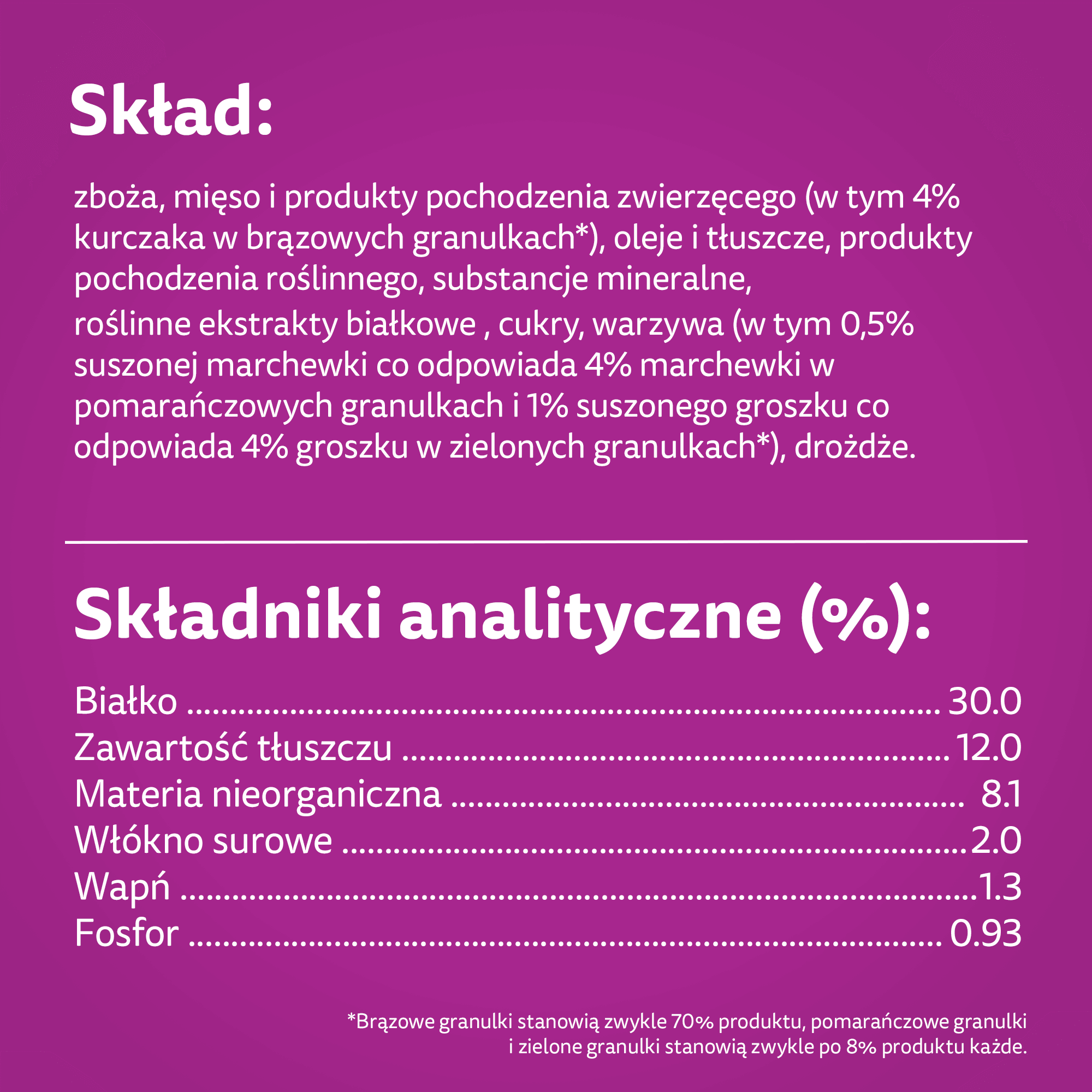 Skład: zboża, mięso i produkty pochodzenia zwierzęcego (w tym 4% kurczaka w brązowych granulkach*), oleje i tłuszcze, produkty pochodzenia roślinnego, substancje mineralne, roślinne ekstrakty białkowe , cukry, warzywa (w tym 0,5% suszonej marchewki, co odpowiada 4% marchewki w pomarańczowych granulkach i 1% suszonego groszku, co odpowiada 4% groszku w zielonych granulkach*), drożdże.