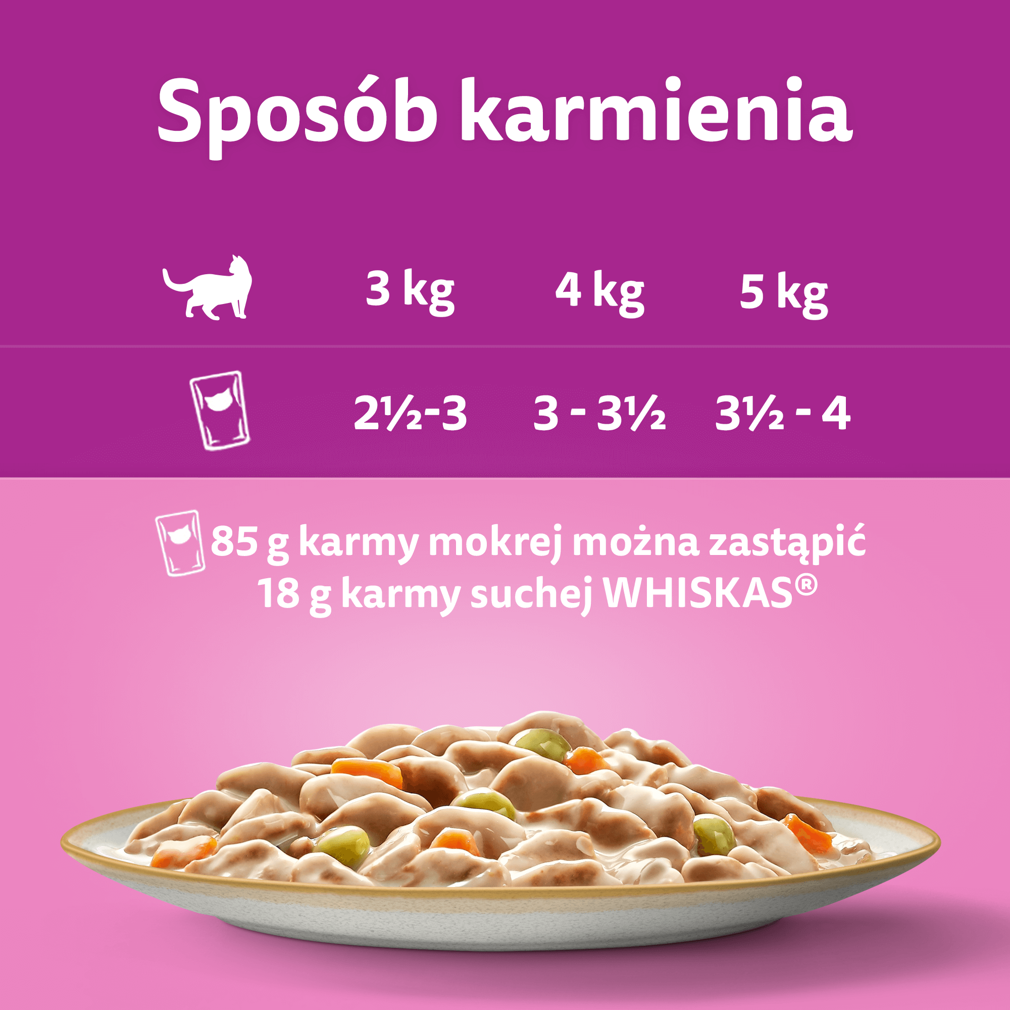 85 g karmy mokrej można zastąpić 18 g karmy suchej WHISKAS®.