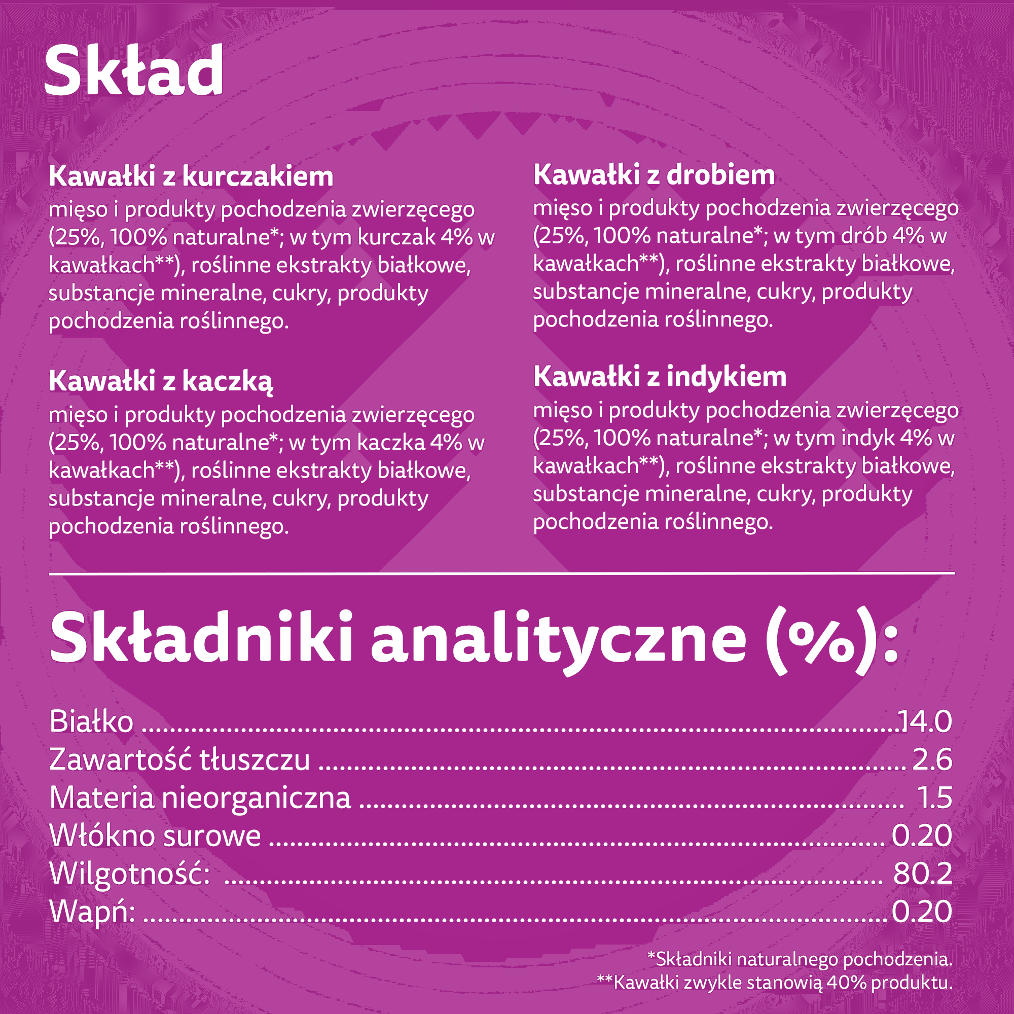Kawałki z drobiem - skład: mięso i produkty pochodzenia zwierzęcego (25%, 100% naturalne*; w tym drób 4% w kawałkach**), roślinne ekstrakty białkowe, substancje mineralne, cukry, produkty pochodzenia roślinnego. *Składniki naturalnego pochodzenia. **Kawałki zwykle stanowią 40% produktu.