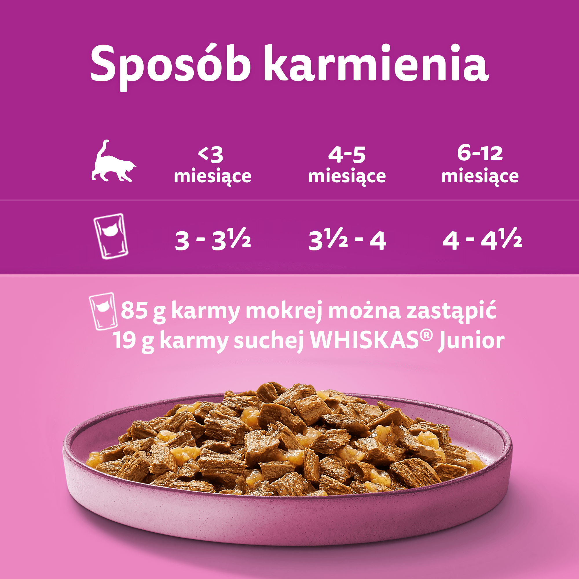 85 g karmy mokrej można zastąpić 19 g karmy suchej WHISKAS® Junior.