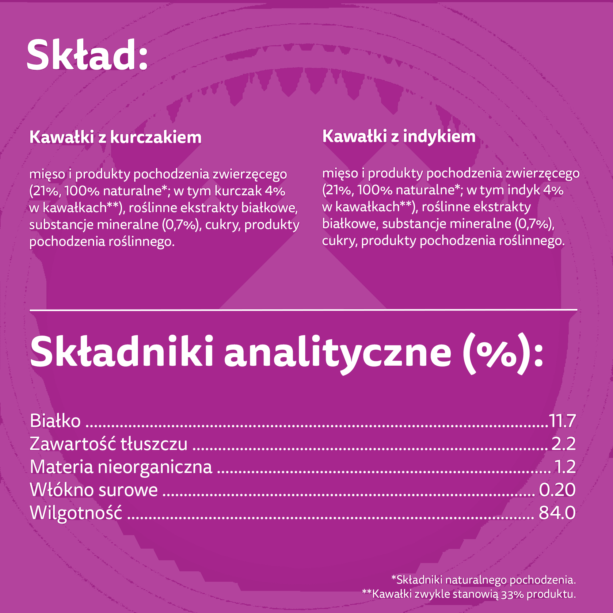 Kawałki z kurczakiem - skład: mięso i produkty pochodzenia zwierzęcego (21%, 100% naturalne*; w tym kurczak 4% w kawałkach**), roślinne ekstrakty białkowe, substancje mineralne (0,7%), cukry, produkty pochodzenia roślinnego. *Składniki naturalnego pochodzenia. **Kawałki zwykle stanowią 33% produktu.