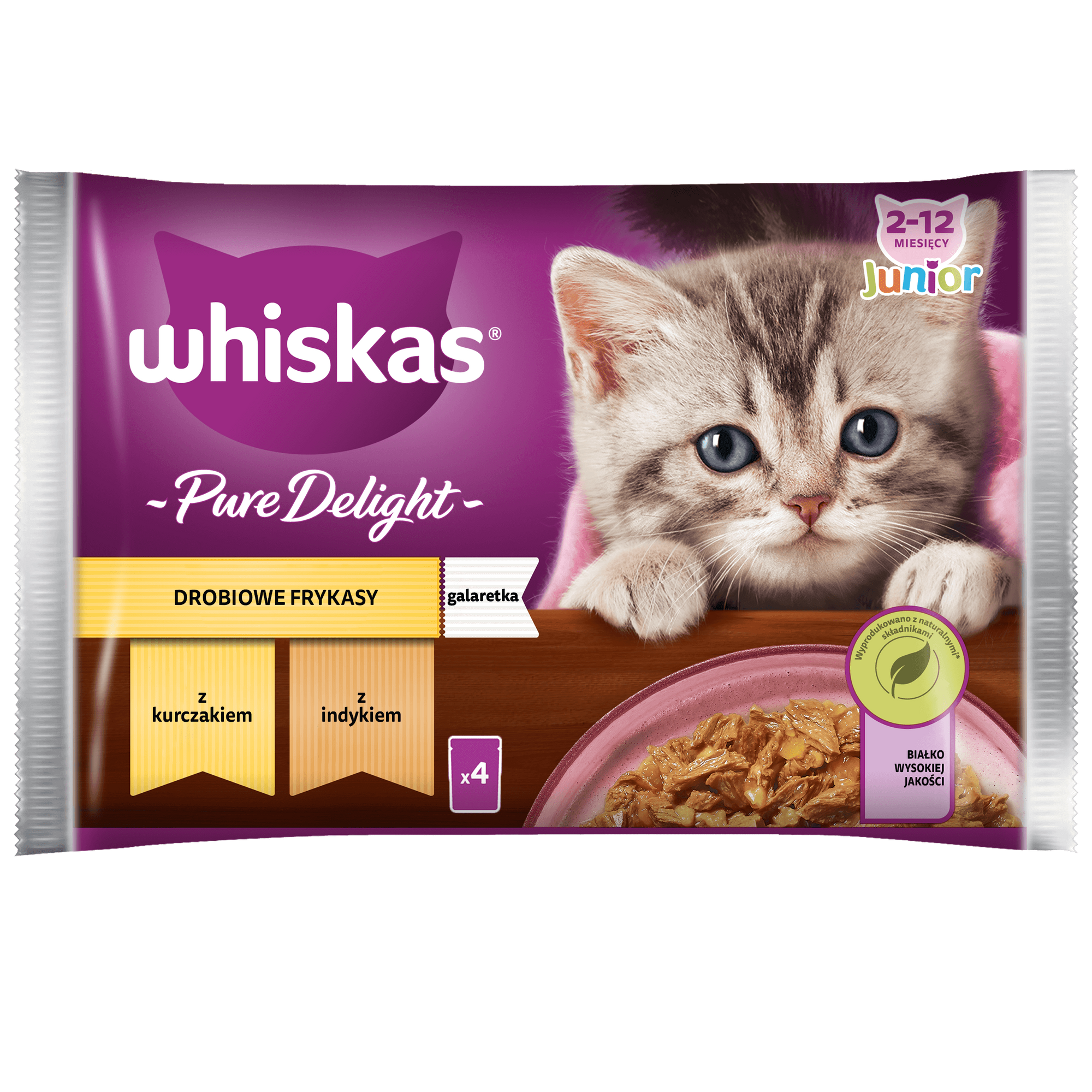 Pyszne kawałki jedzenia Whiskas Junior Drobiowe Frykasy w galaretce są przygotowane tak, aby zachować ich naturalny smak i wartości odżywcze. Dzięki gotowaniu na parze są one soczyste i delikatne, co sprawi, że Twój kot będzie mruczał z zachwytu. Kocię rozsmakuje się w jednym z dwóch wariantów: kawałki z kurczakiem oraz z indykiem. Karma Whiskas jest przygotowana z naturalnymi składnikami i wysokiej jakości białkiem, bez użycia sztucznych barwników i konserwantów dla wyjątkowej przyjemności jedzenia i zdrowego rozwoju. Łatwe do zjedzenia pyszne, delikatne kąski zawierają cynk, który wspiera zdrowie skóry i sierści, a także wszystkie składniki odżywcze, których potrzebuje Twoje kocię, gdy dorasta i odkrywa nowy świat.