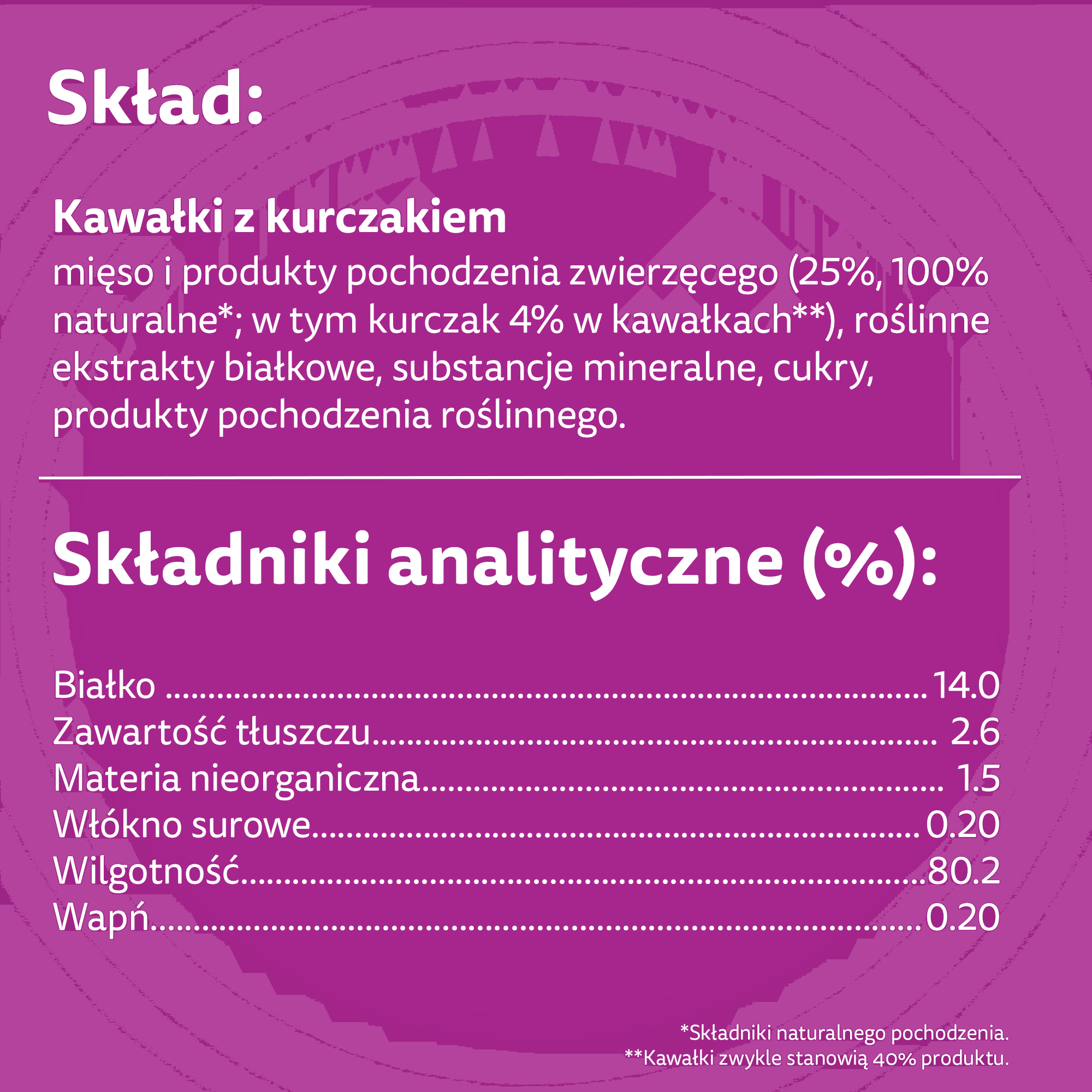 Skład: mięso i produkty pochodzenia zwierzęcego (25%, 100% naturalne*; w tym kurczak 4% w kawałkach**), roślinne ekstrakty białkowe, substancje mineralne, cukry, produkty pochodzenia roślinnego. *Składniki naturalnego pochodzenia. **Kawałki zwykle stanowią 40% produktu.