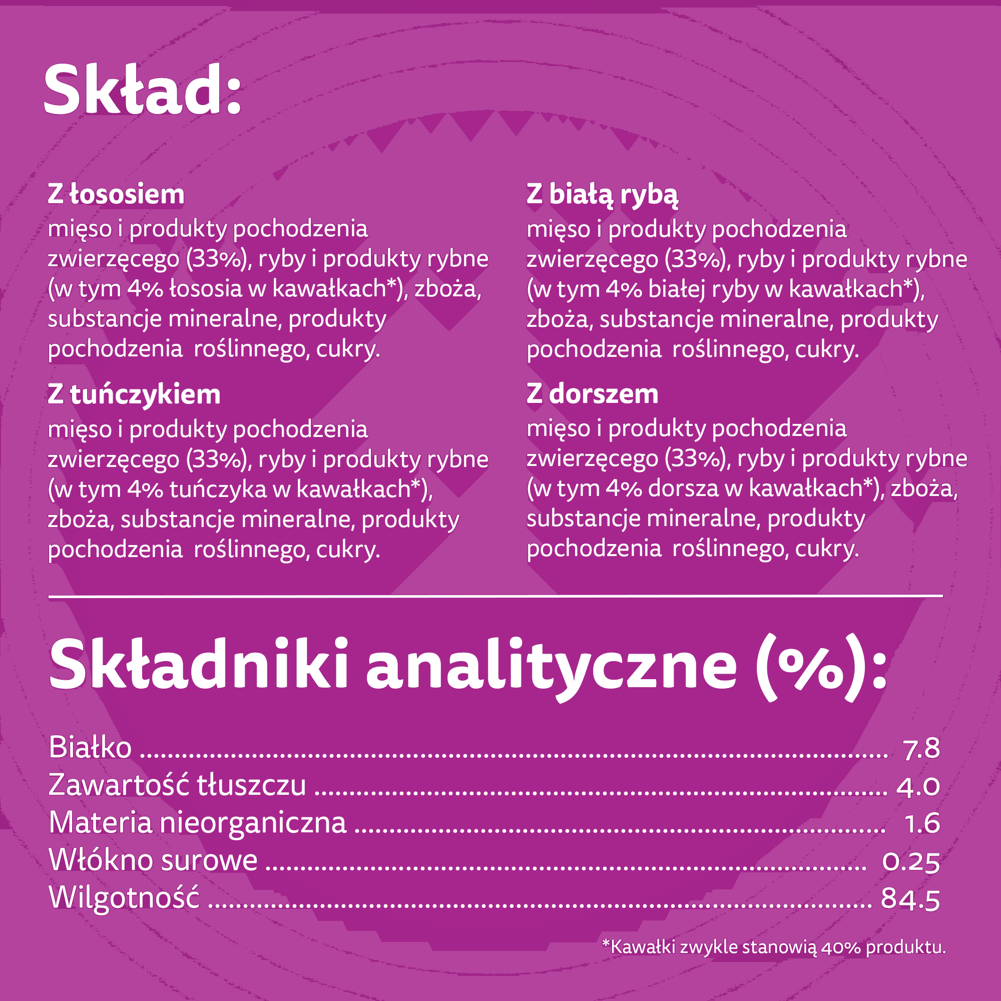 Kawałki z białą rybą - skład: mięso i produkty pochodzenia zwierzęcego (33%), ryby i produkty rybne (w tym 4% białej ryby w kawałkach*), zboża, substancje mineralne, produkty pochodzenia roślinnego, cukry. *Kawałki zwykle stanowią 40% produktu.