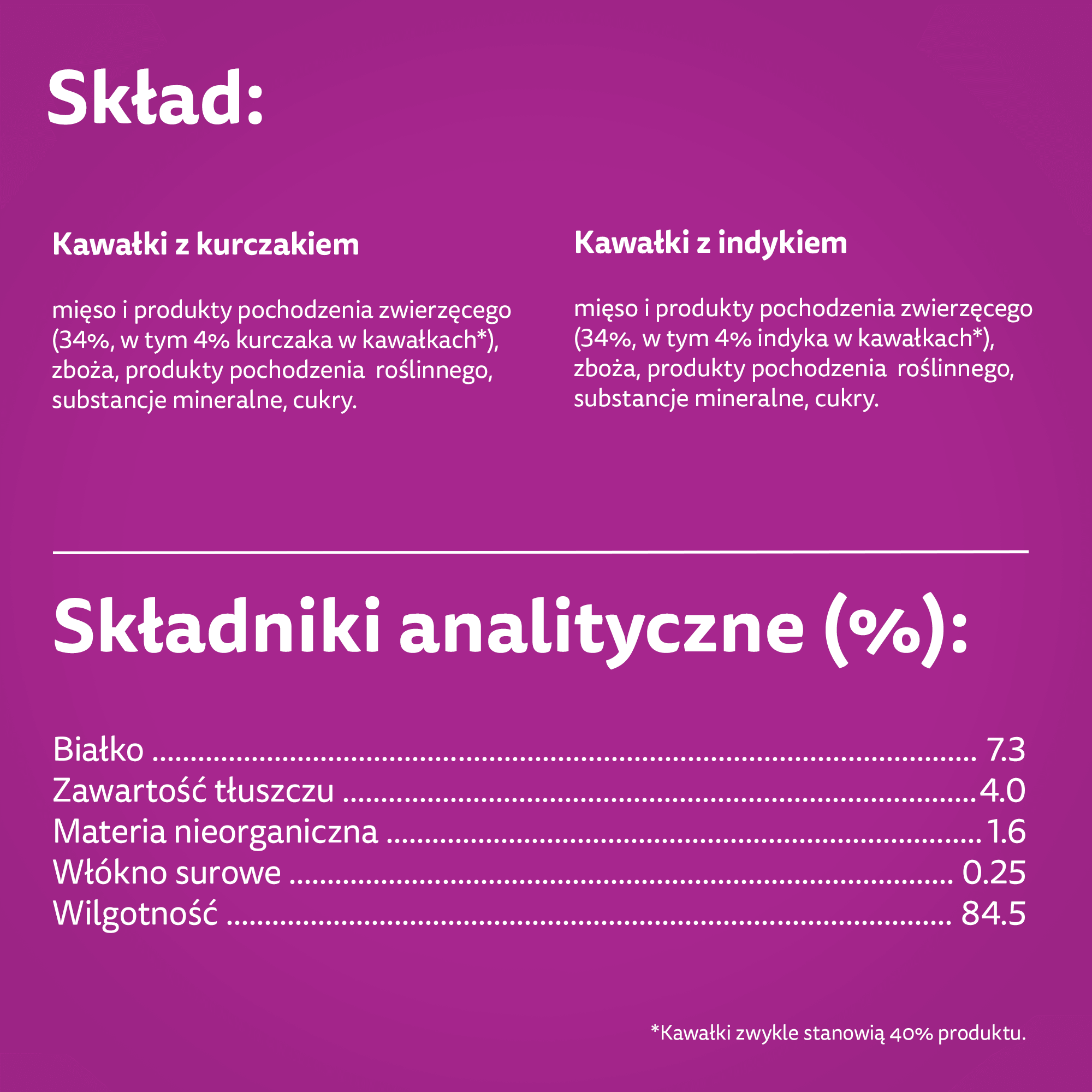 Kawałki z kurczakiem - skład: mięso i produkty pochodzenia zwierzęcego (34%, w tym 4% kurczaka w kawałkach*), zboża, produkty pochodzenia roślinnego, substancje mineralne, cukry. *Kawałki zwykle stanowią 40% produktu.