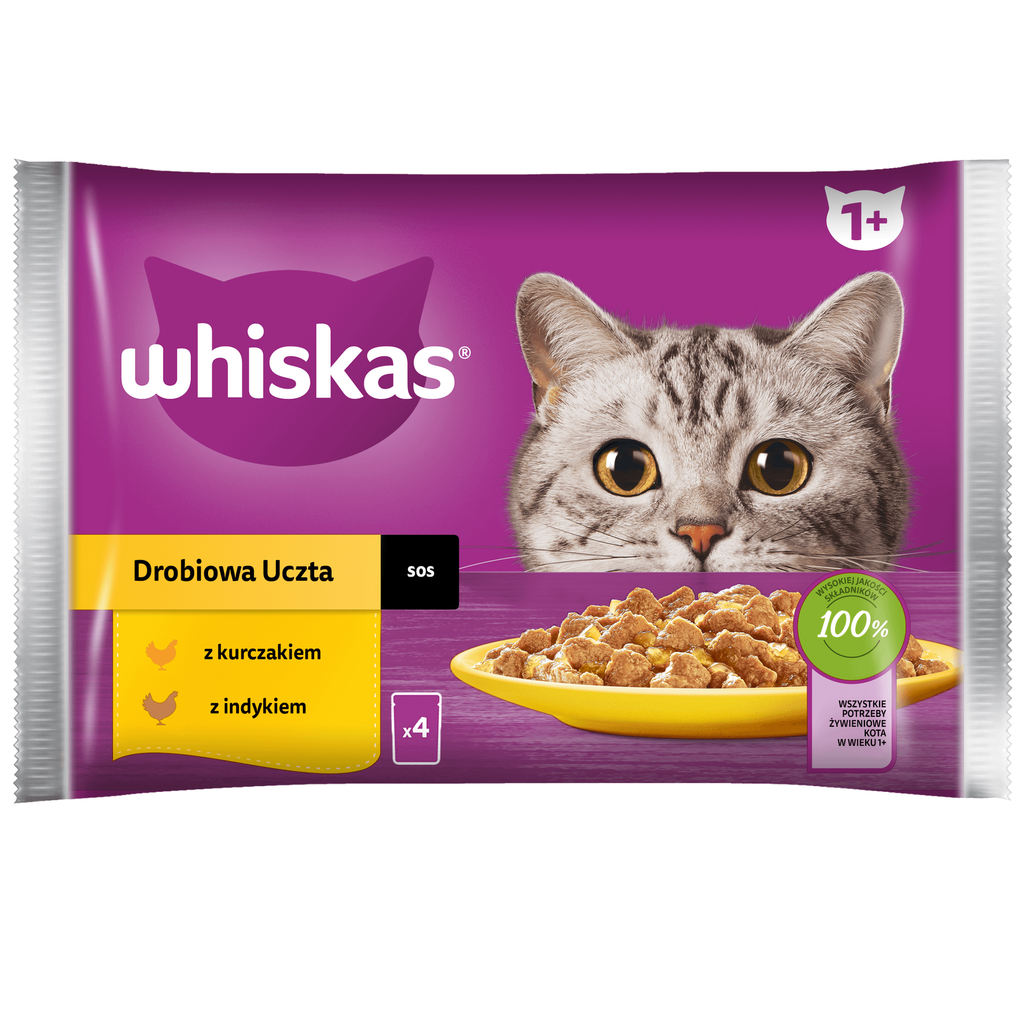 WHISKAS Adult saszetka 4 x 85 g Drobiowa Uczta - mokra karma pełnoporcjowa dla dorosłych kotów, w sosie (kawałki z: kurczakiem, indykiem)