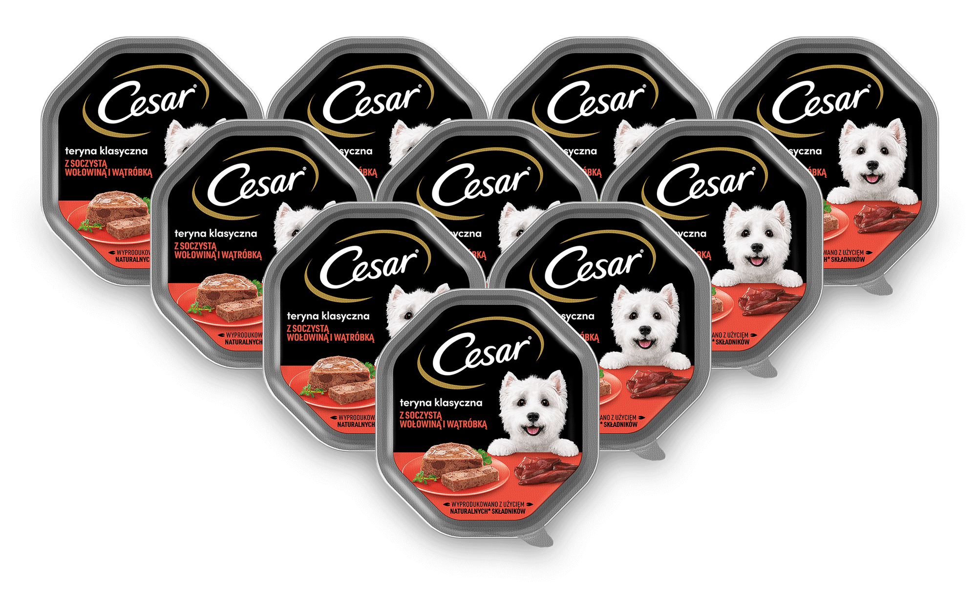 Wykwintne danie dla psa Cesar® z soczystą wołowiną i wątróbką zostało przygotowane według starannie dobranej receptury, która zapewni Twojemu pupilowi wszystko, czego potrzebuje każdego dnia. Wysokiej jakości, zdrowe i pyszne jedzenie Cesar® to kompletny i zbilansowany posiłek, który możesz podawać jako samodzielne danie lub z suchą karmą. Wyjątkowe danie z soczystą wołowiną i wątróbką ma formę apetycznej teryny. Tacki Cesar® zmienią posiłki Twojego pupila w radosne chwile. Podając psu ten pełnoporcjowy pokarm dzielisz się z nim tym, co najlepsze i wzbogacasz Waszą niesamowitą więź. Jedzenie Cesar® zostało przygotowane z udziałem dietetyków i lekarzy weterynarii z Instytutu Nauki o Zwierzętach WALTHAM™ tak, aby zachować jego naturalne wartości odżywcze i znakomity smak.