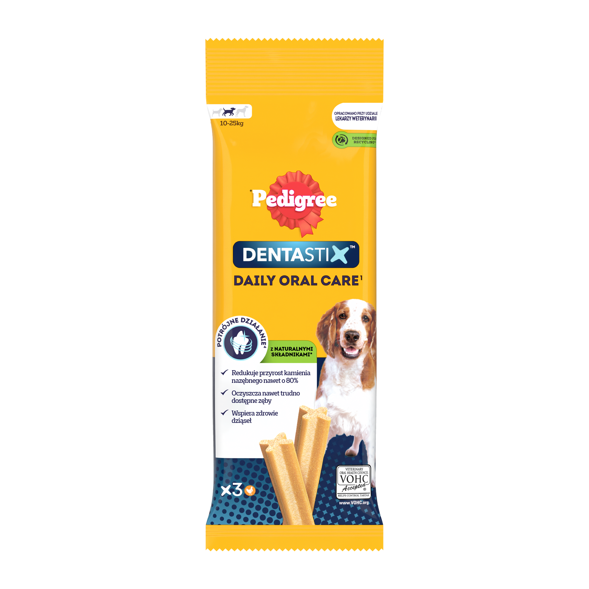 Pedigree DentaStix to smaczny przysmak dentystyczny o unikalnym kształcie X i specjalnej powierzchni ściernej dla psów średnich ras. Podawany codziennie ogranicza powstawanie kamienia nazębnego nawet do 80%, co zostało udowodnione badaniami naukowymi. Przysmaki Pedigree DentaStix posiadają strukturę o delikatnych właściwościach ścierających i aktywne składniki, które pomagają ograniczać gromadzenie się osadu i kamienia nazębnego. Dodatkowo, DentaStix zostały opracowane tak, aby Twój pupil długo je żuł, co zwiększa ich skuteczność. Przysmak Pedigree DentaStix ma niską zawartość tłuszczu, nie zawiera sztucznych barwników, aromatów ani dodatku cukru. Zadbaj o higienę jamy ustnej Twojego psa z Pedigree DentaStix codziennie.