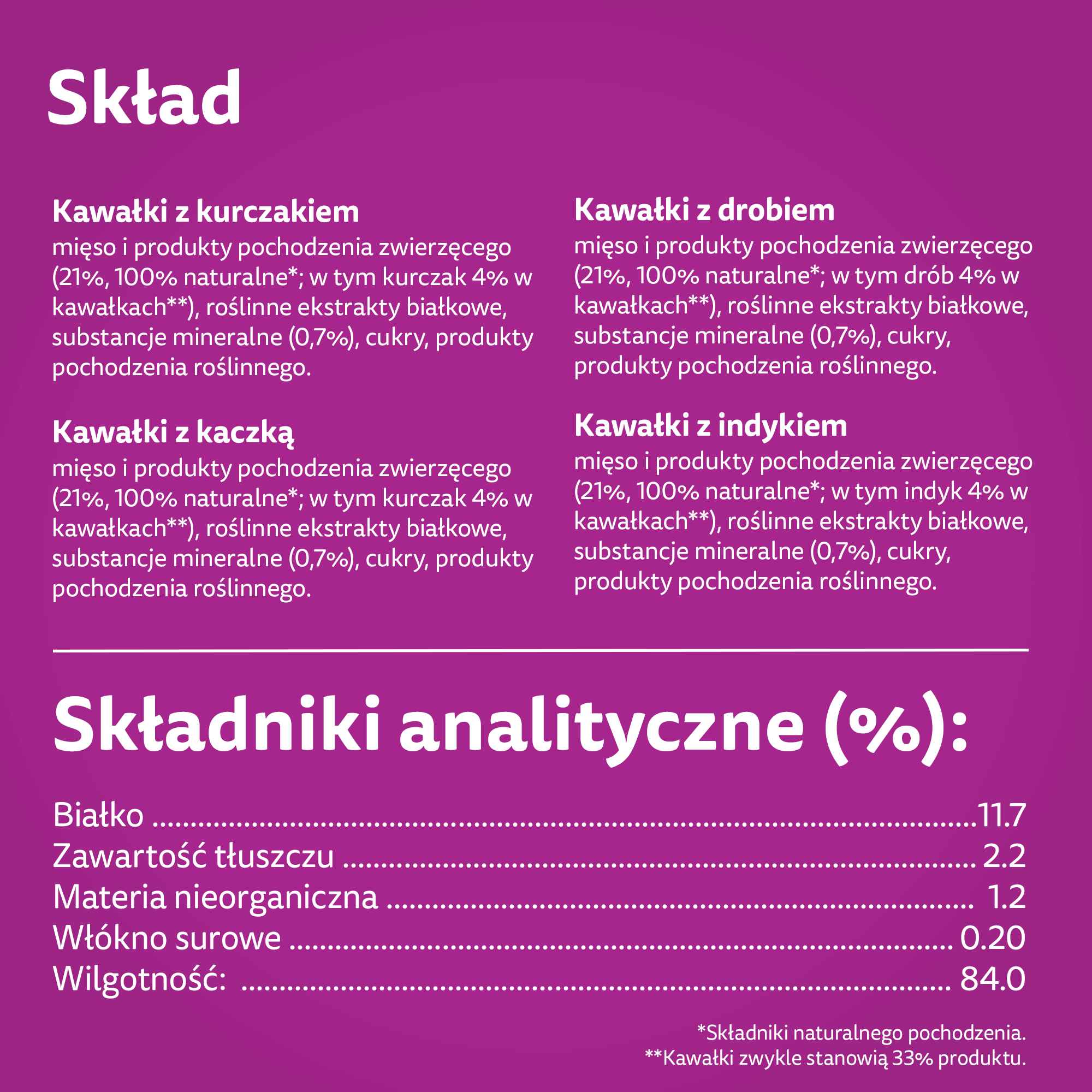 Kawałki z drobiem - skład: mięso i produkty pochodzenia zwierzęcego (21%, 100% naturalne*; w tym drób 4% w kawałkach**), roślinne ekstrakty białkowe, substancje mineralne (0,7%), cukry, produkty pochodzenia roślinnego.*Składniki naturalnego pochodzenia. **Kawałki zwykle stanowią 33% produktu.