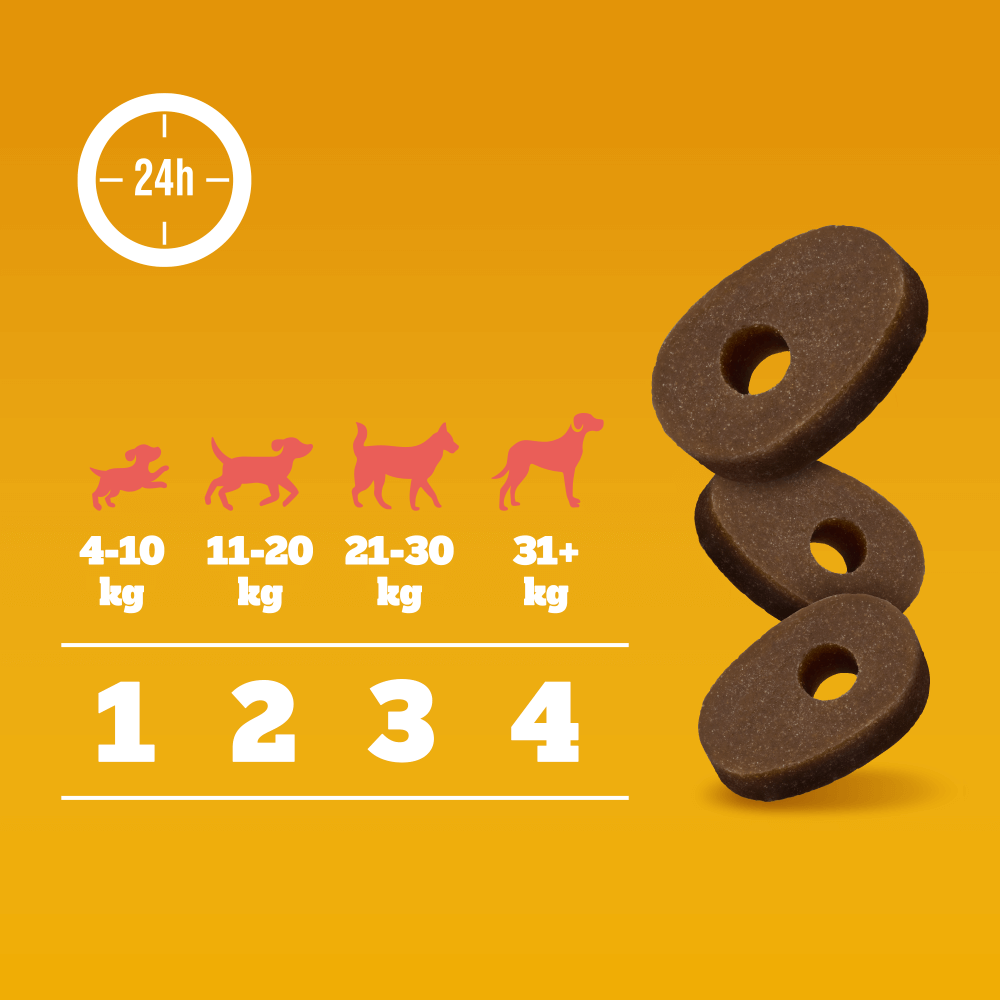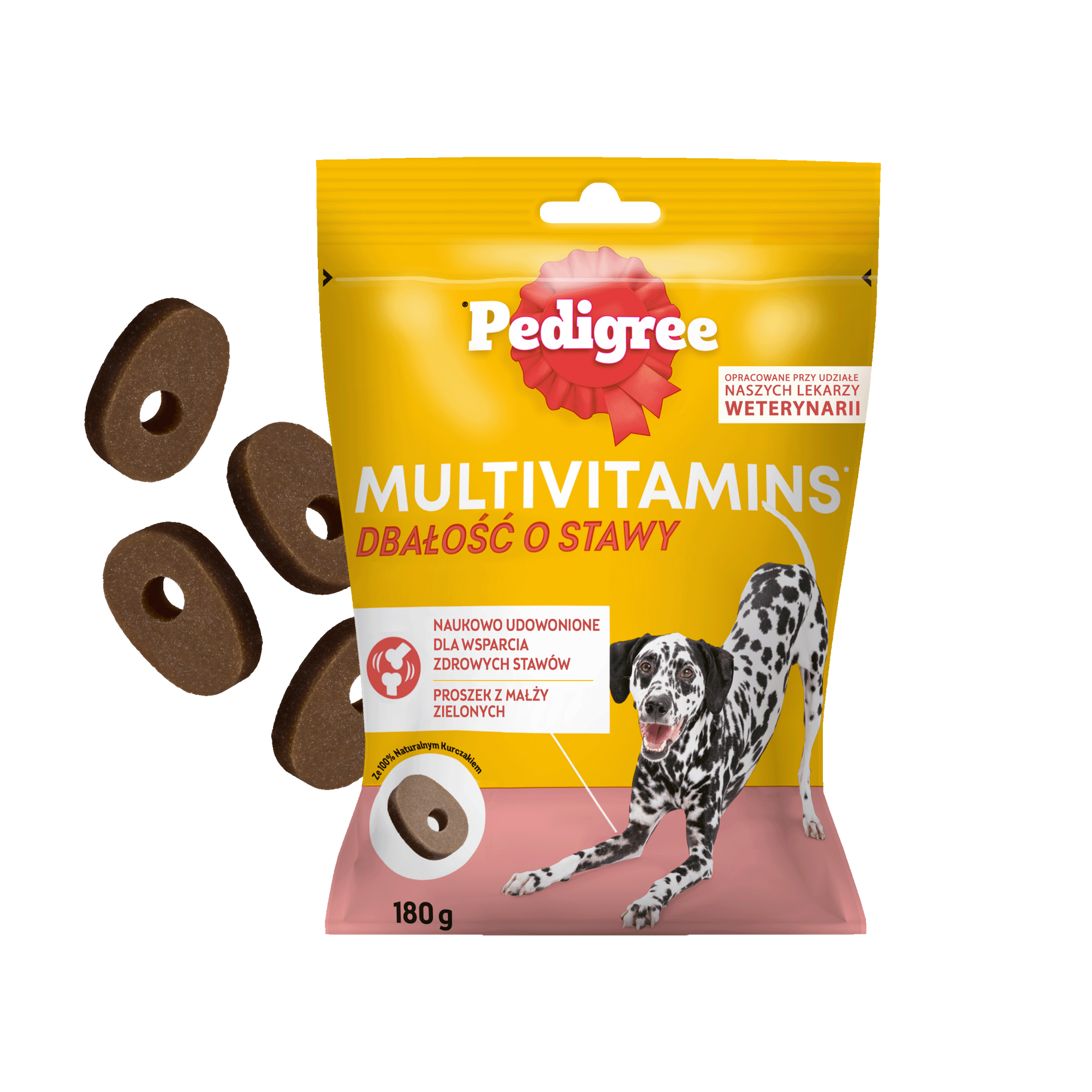 PEDIGREE® Multivitamins Dbałość o stawy to karma uzupełniająca o smaku kurczaka przeznaczona dla dorosłych psów, która wspiera zdrowe stawy dzięki zawartości proszku z małży zielonych, co zostało udowodnione naukowo. Skład został opracowany przez lekarzy weterynarii i specjalistów ds. dietetyki z Instytutu Nauki o Zwierzętach WALTHAM™. Z PEDIGREE® Multivitamins Dbałość o stawy skutecznie troszczysz się o zdrowie i witalność swojego psa. W każdej porcji znajduje się specjalnie dopasowana mieszanka multiwitamin i glukozaminy. Ta karma uzupełniająca została opracowana ze składników najwyższej jakości, bez użycia sztucznych barwników i dodatków smakowych. W opakowaniu znajduje się około 30 kawałków.