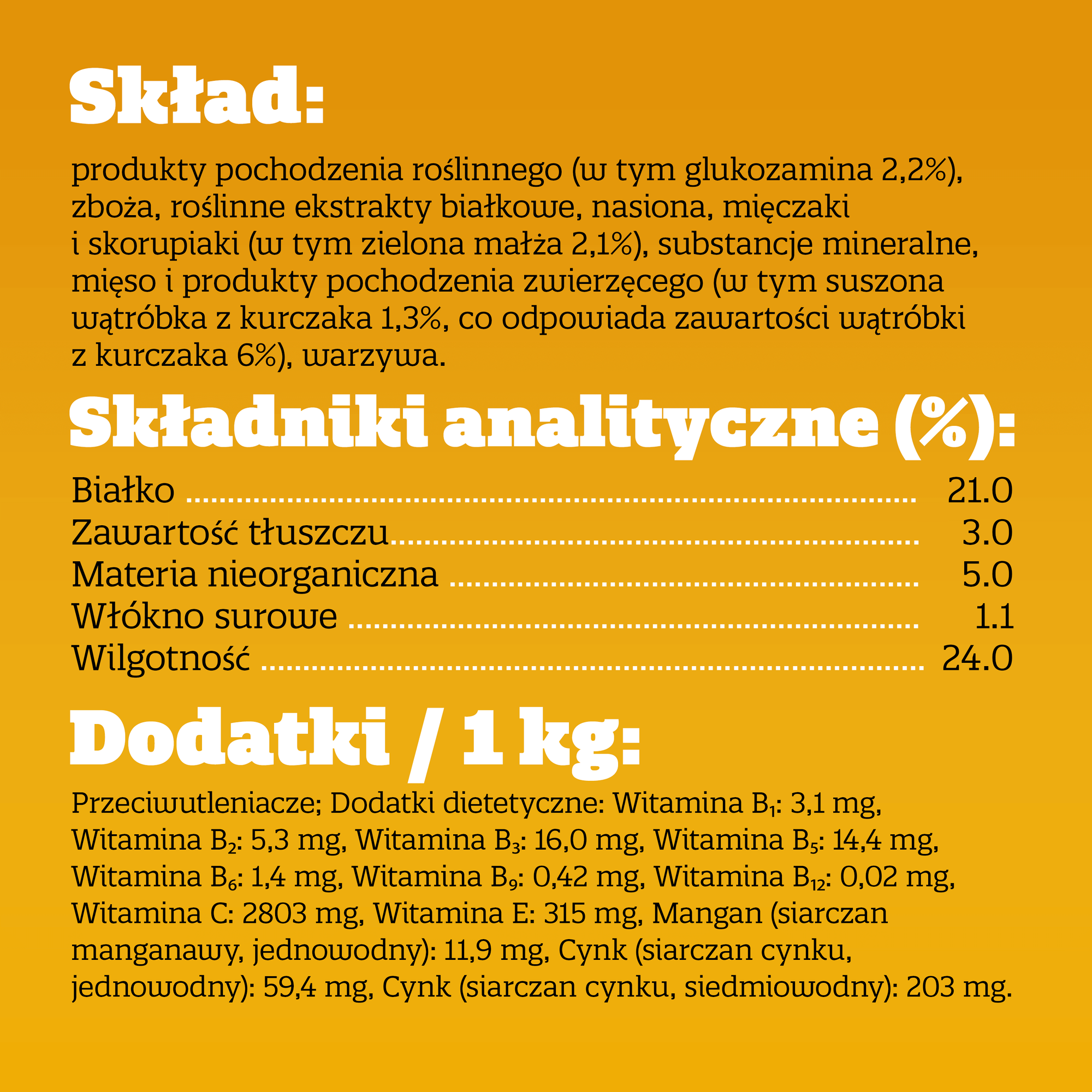 Skład: produkty pochodzenia roślinnego (w tym glukozamina 2,2%), zboża, roślinne ekstrakty białkowe, nasiona, mięczaki i skorupiaki (w tym zielona małża 2,1%), substancje mineralne, mięso i produkty pochodzenia zwierzęcego (w tym suszona wątróbka z kurczaka 1,3%, co odpowiada zawartości wątróbki z kurczaka 6%), warzywa.