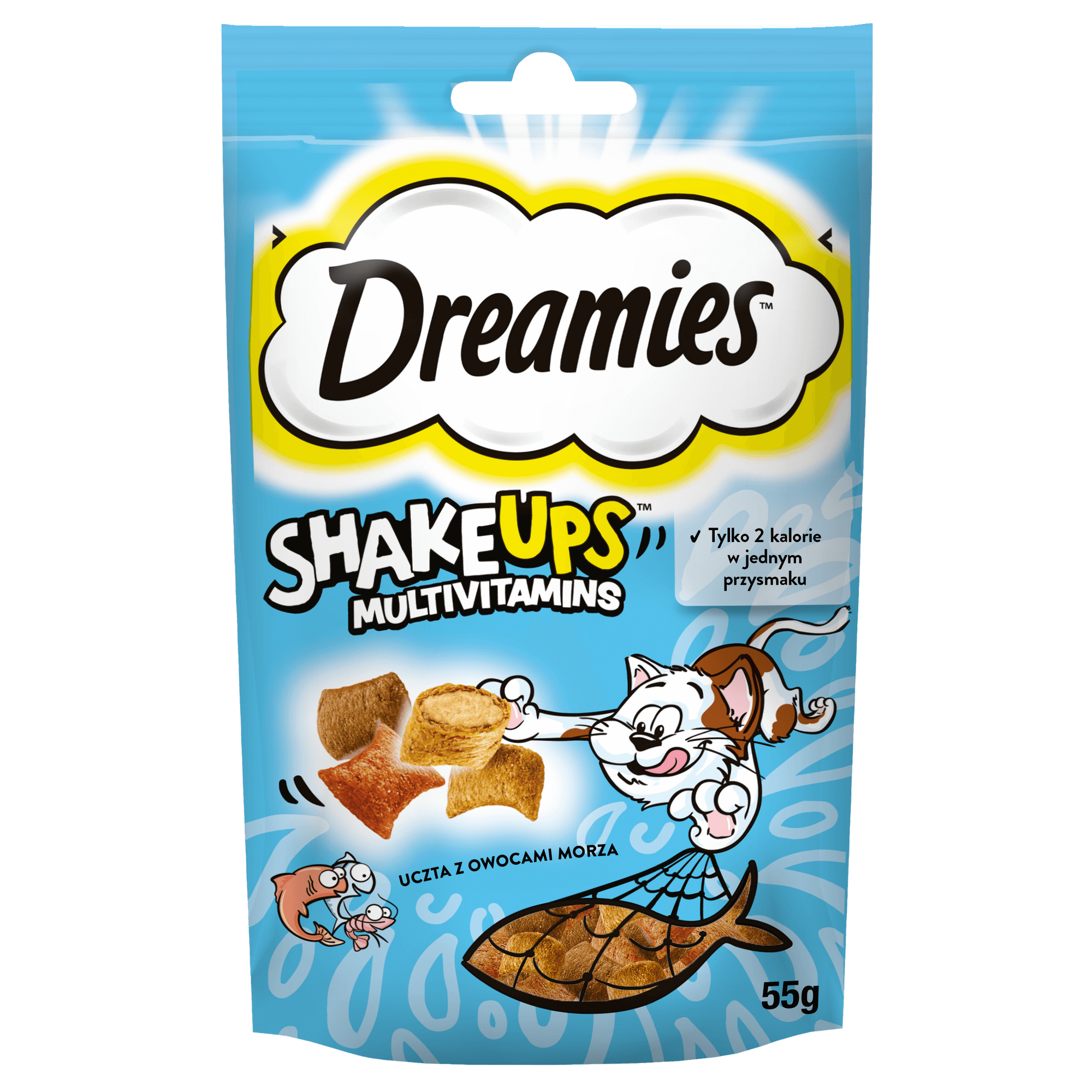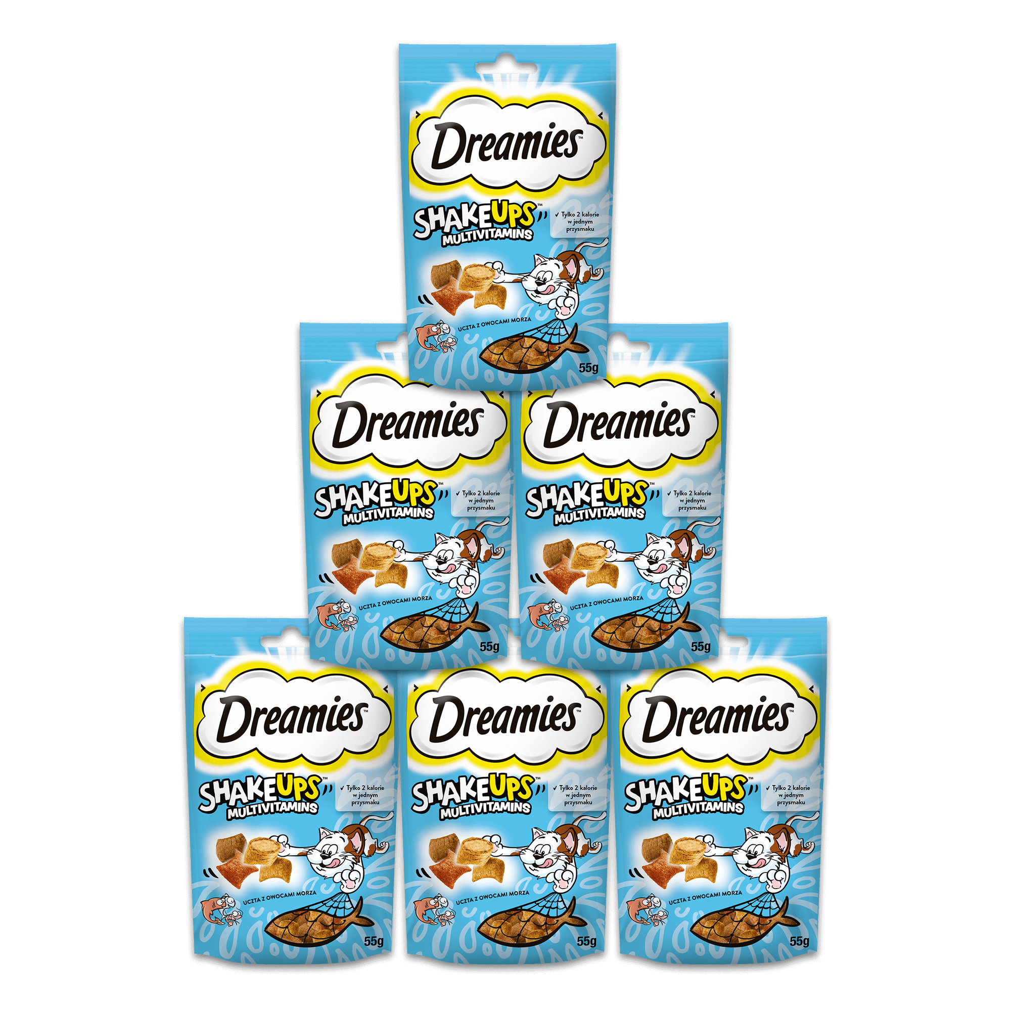 DREAMIES Shake Ups Multivitamins 6x55 g – przysmak dla kota, uczta z owocami morza (o smaku łososia, tuńczyka i krewetek)