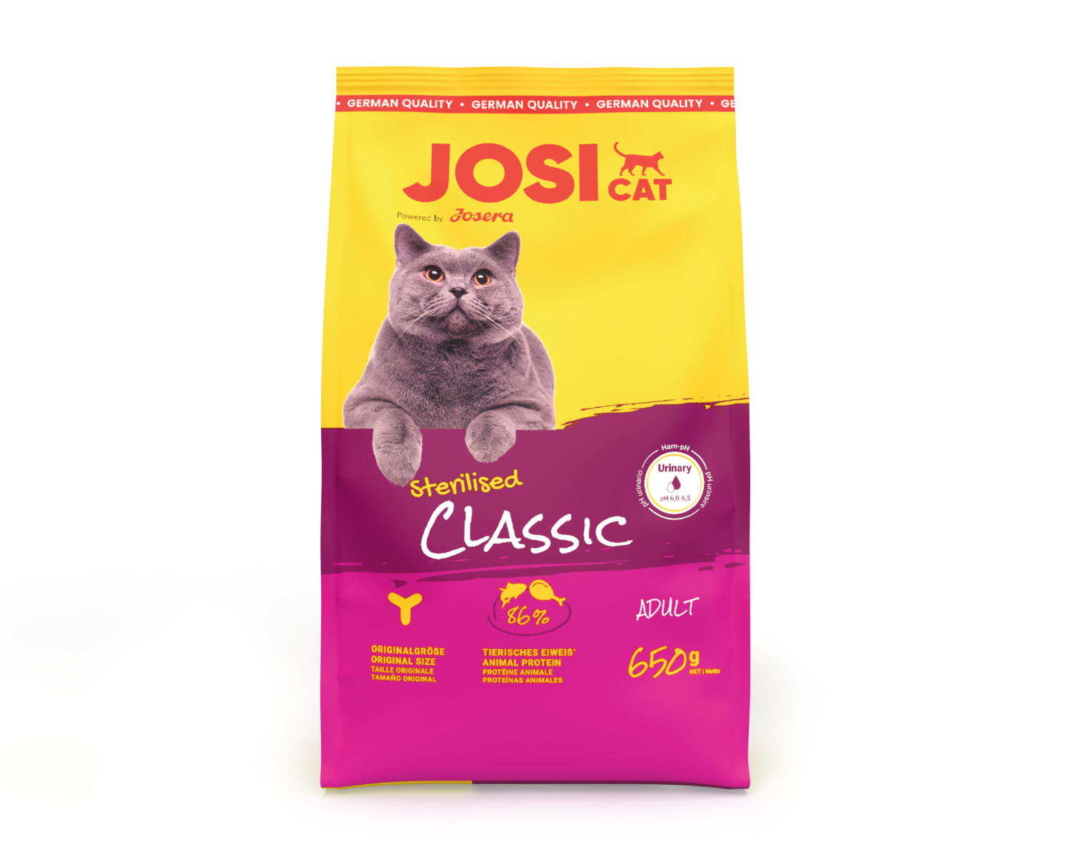 Przebój wśród kotów! JosiCat Sterilised Classic to pełnowartościowa karma z odpowiednimi składnikami wyselekcjonowanymi tak, aby spełniały zmienione po kastracji zapotrzebowanie kotów na składniki odżywcze. Wysokiej jakości składniki tworzą zbilansowaną dietę, która zapewnia Twojemu kotu wszystko, czego potrzebuje, dzień po dniu.