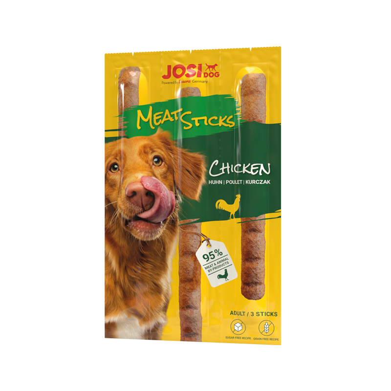 Wysoka zawartość mięsa sprawia, że nasze przysmaki Meat Sticks są absolutnie ulubioną przekąską dorosłych psów. Praktyczne opakowanie zawiera 3 pojedynczo zamknięte podłużne przysmaki mięsne JosiDog i doskonale nadaje się również do zabrania w podróż.