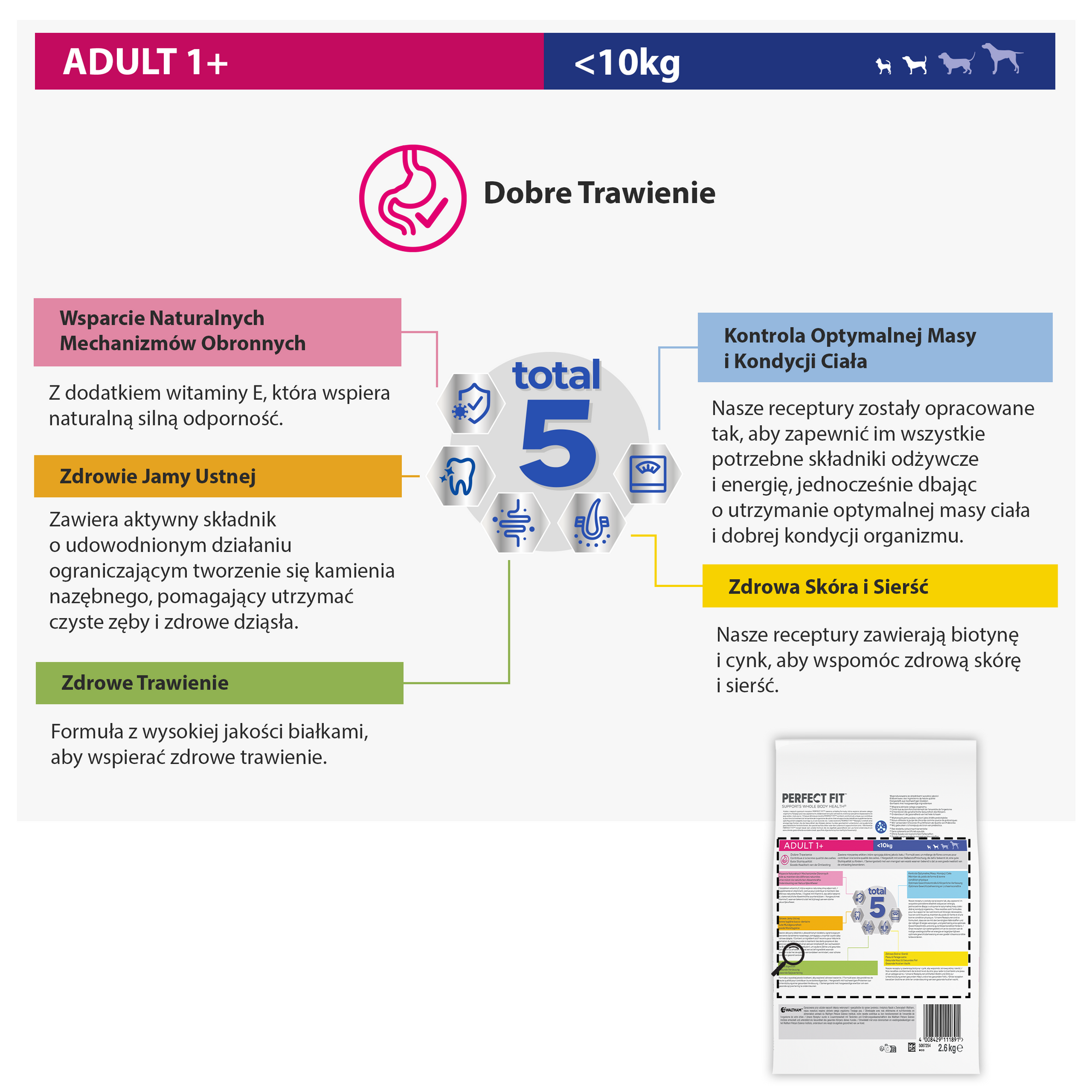 Pyszny pokarm Perfect Fit™ Adult 1+ bogaty w kurczaka zawiera wyjątkową formułę Total 5, która wspiera 5 najważniejszych obszarów zdrowia dorosłego pupila: wspomaga silny układ odpornościowy, zdrowie jamy ustnej, zdrowe trawienie, zdrową skórę i sierść oraz utrzymanie optymalnej kondycji i masy ciała. Receptura Perfect Fit™ Adult 1+ została opracowana we współpracy z lekarzami weterynarii oraz specjalistami ds. żywienia z Instytutu Nauki o Zwierzętach WALTHAM™, aby dostarczyć niezbędne składniki odżywcze dorosłym psom. Tak jak inne warianty, również pokarm Perfect Fit™ Adult 1+ bogaty w kurczaka dostarcza dodatkowe korzyści: wspomaga dobre trawienie dzięki optymalnej mieszance włókien pokarmowych oraz zawiera prebiotyki, aby dbać o mikrobiom jelitowy. Wybierając to pożywienie dla swojego pupila małej rasy, masz pewność, że unikalna formuła Perfect Fit™ wspiera zdrowie całego organizmu Twojego psa oraz zapewnia mu dodatkowe korzyści zdrowotne, które są specjalnie dopasowane do jego wieku i indywidulanych wymagań.