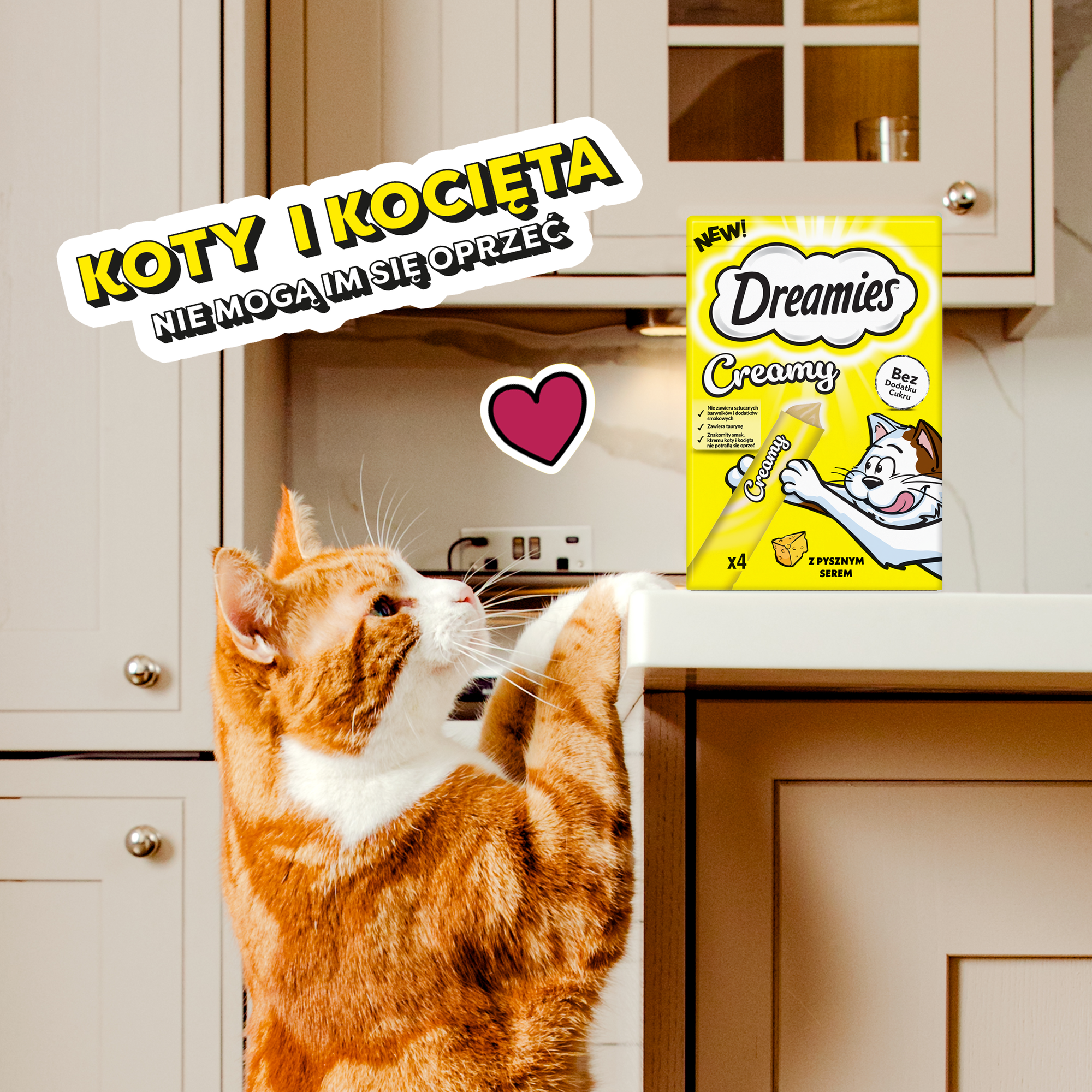 DREAMIES™ Creamy z pysznym serem to przysmak stworzony specjalnie z myślą o kotach. Idealny jako dodatek do karmy dla dorosłych kotów i kociąt powyżej 8 tygodnia życia. Zawiera taurynę, której Twój pupil potrzebuje do prawidłowego rozwoju na każdym etapie swojego życia. Znakomite połączenie smaku i kremowej konsystencji przysmaków DREAMIES™ sprawi, że Twój kot nie będzie mógł się im oprzeć. Kremową przekąskę DREAMIES™ Creamy można podawać w miseczce, dodać do codziennego posiłku kota, a także karmić nią pupila z ręki by cieszyć się wspólnymi chwilami. Ten smaczny pokarm w wygodnej saszetce pozbawiony jest sztucznych barwników, dodatków smakowych oraz cukru. Został opracowany przez lekarzy weterynarii i specjalistów ds. dietetyki z Instytutu Nauki o Zwierzętach WALTHAM™.