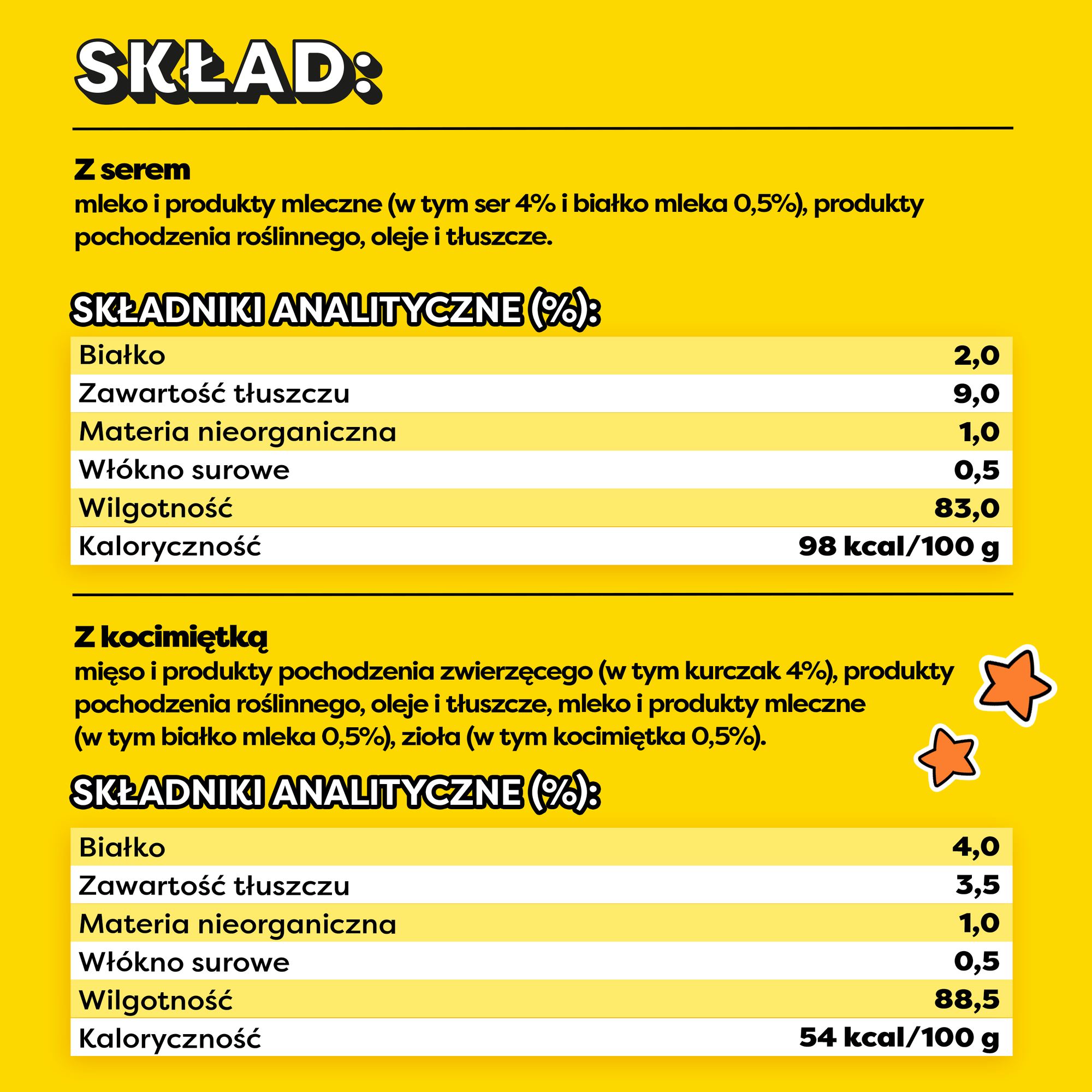 Skład: mięso i produkty pochodzenia zwierzęcego (w tym kurczak 4%), produkty pochodzenia roślinnego, oleje i tłuszcze, mleko i produkty mleczne (w tym białko mleka 0,5%), zioła (w tym kocimiętka 0,5%).