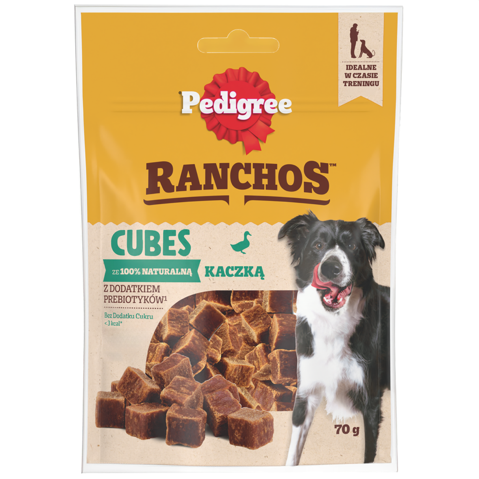 Pedigree® Ranchos™ Cubes ze 100% naturalną kaczką to karma uzupełniająca dla psów powyżej 8 tygodnia życia i o wadze powyżej 2 kg. Receptura opracowana przez lekarzy weterynarii i specjalistów ds. dietetyki z Instytutu Nauki o Zwierzętach WALTHAM™ zawiera w składzie jabłka, które są naturalnym źródłem prebiotyków. Pedigree® Ranchos™ Cubes nie zawierają cukru, sztucznych barwników i dodatków smakowych. Te apetyczne przysmaki w formie kostek idealnie sprawdzą się w czasie treningu psów w każdym wieku, są odpowiednie również dla szczeniąt. W trosce o szczupłą sylwetkę Twojego psa jeden przysmak zawiera mniej niż 3 kalorie. Podając Pedigree® Ranchos™ Cubes swojemu pupilowi, dajesz mu to co najlepsze.