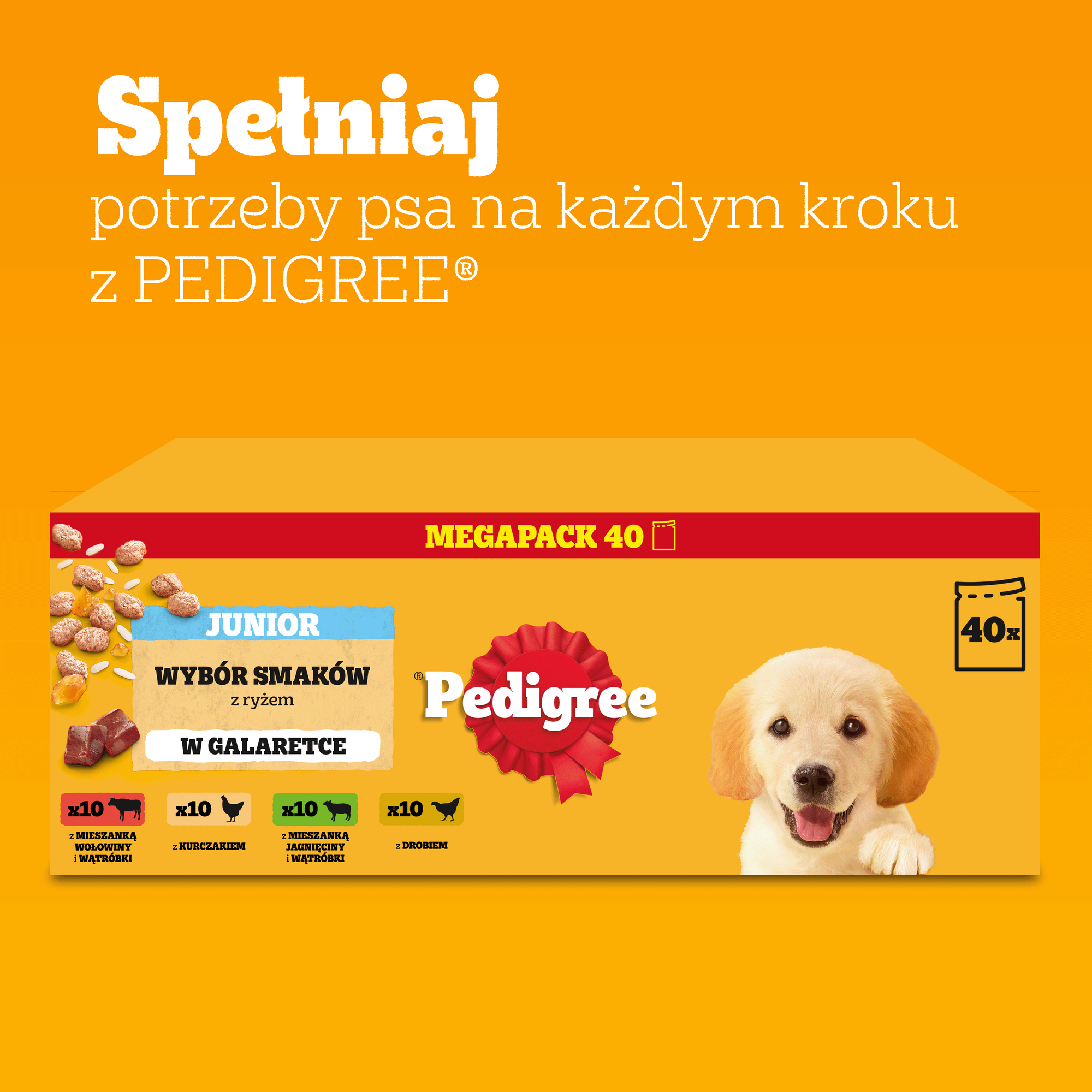 Mokra karma PEDIGREE® Junior Wybór Smaków w smakowitej galaretce to pełnoporcjowe pożywienie ze wszystkimi minerałami i witaminami niezbędnymi dla zdrowego rozwoju. Jest przeznaczone dla dorastających psów. Twoje szczenię rozsmakuje się w czterech wariantach smakowych: kawałki z mieszanką wołowiny i wątróbki i ryżem, z kurczakiem i ryżem, z mieszanką jagnięciny i wątróbki i ryżem, z drobiem i ryżem. Receptura została opracowana przez lekarzy weterynarii i specjalistów ds. dietetyki z Instytutu Nauki o Zwierzętach WALTHAM™. Twój dorastający pupil zasługuje na zdrowy rozwój, dlatego PEDIGREE® Junior zawiera odpowiednią ilość wapnia i fosforu, aby wspierać mocne kości. Zawarte w składzie witamina E i przeciwutleniacze wspomagają naturalne mechanizmy obronne, dzięki czemu Twój pies może dalej odkrywać wielki, wspaniały świat. Karma PEDIGREE® Junior zawiera włókno pokarmowe, które jest łatwo wchłaniane przez rozwijający się układ pokarmowy, bo każde szczenię zasługuje na zdrowy brzuszek.