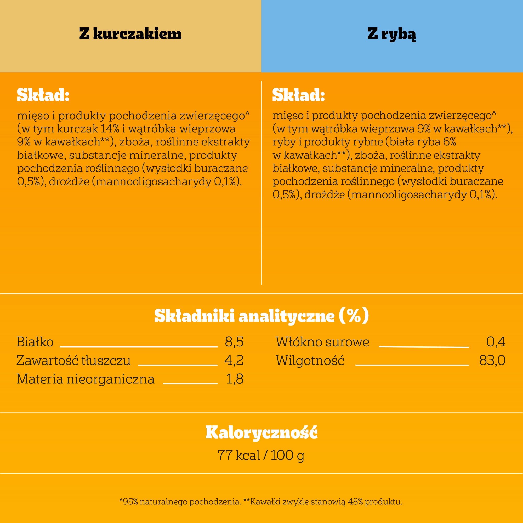 Skład: mięso i produkty pochodzenia zwierzęcego^ (w tym kurczak 14% i wątróbka wieprzowa 9% w kawałkach**), zboża, roślinne ekstrakty białkowe, substancje mineralne, produkty pochodzenia roślinnego (wysłodki buraczane 0,5%), drożdże (mannooligosacharydy 0,1%). ^95% naturalnego pochodzenia. **Kawałki zwykle stanowią 48% produktu.