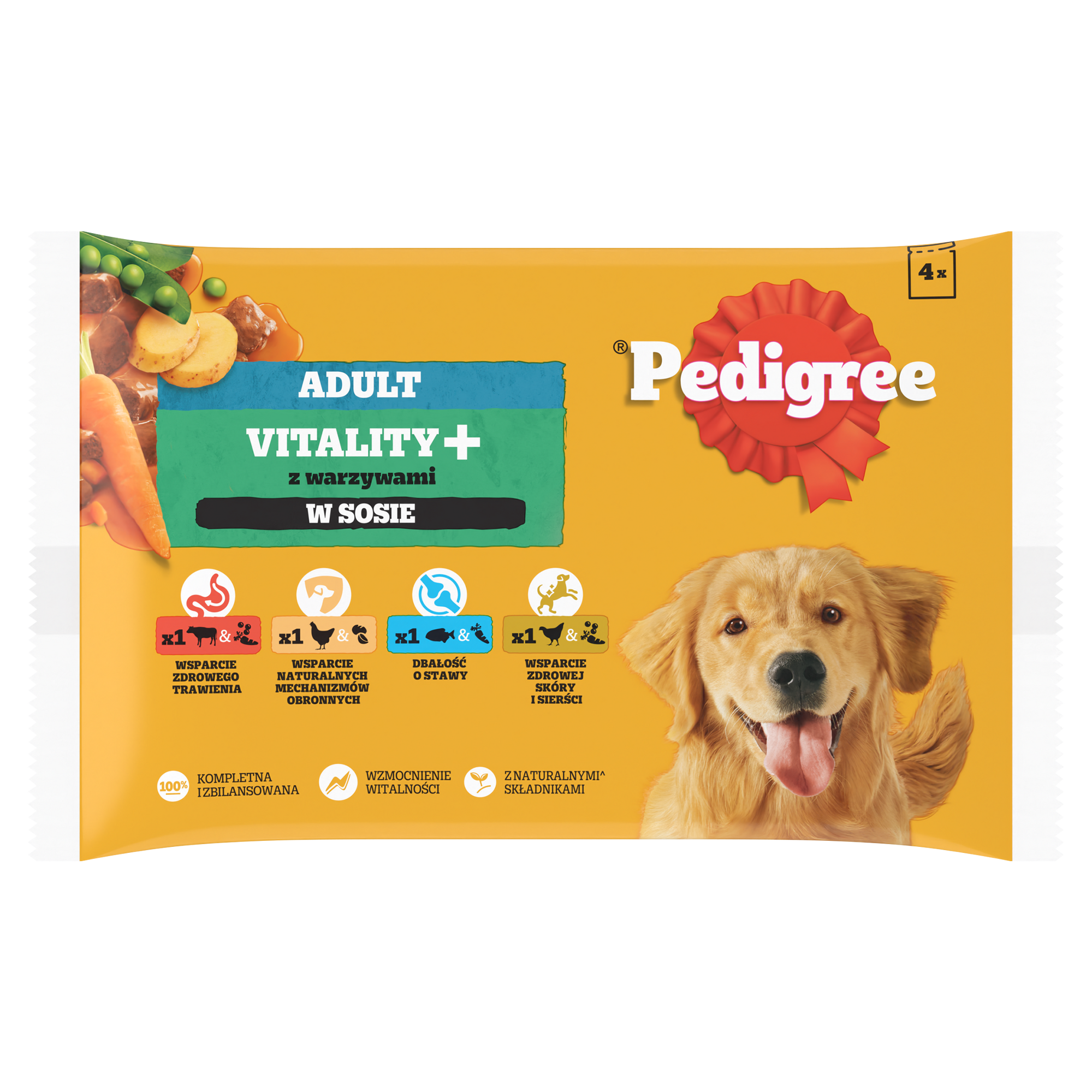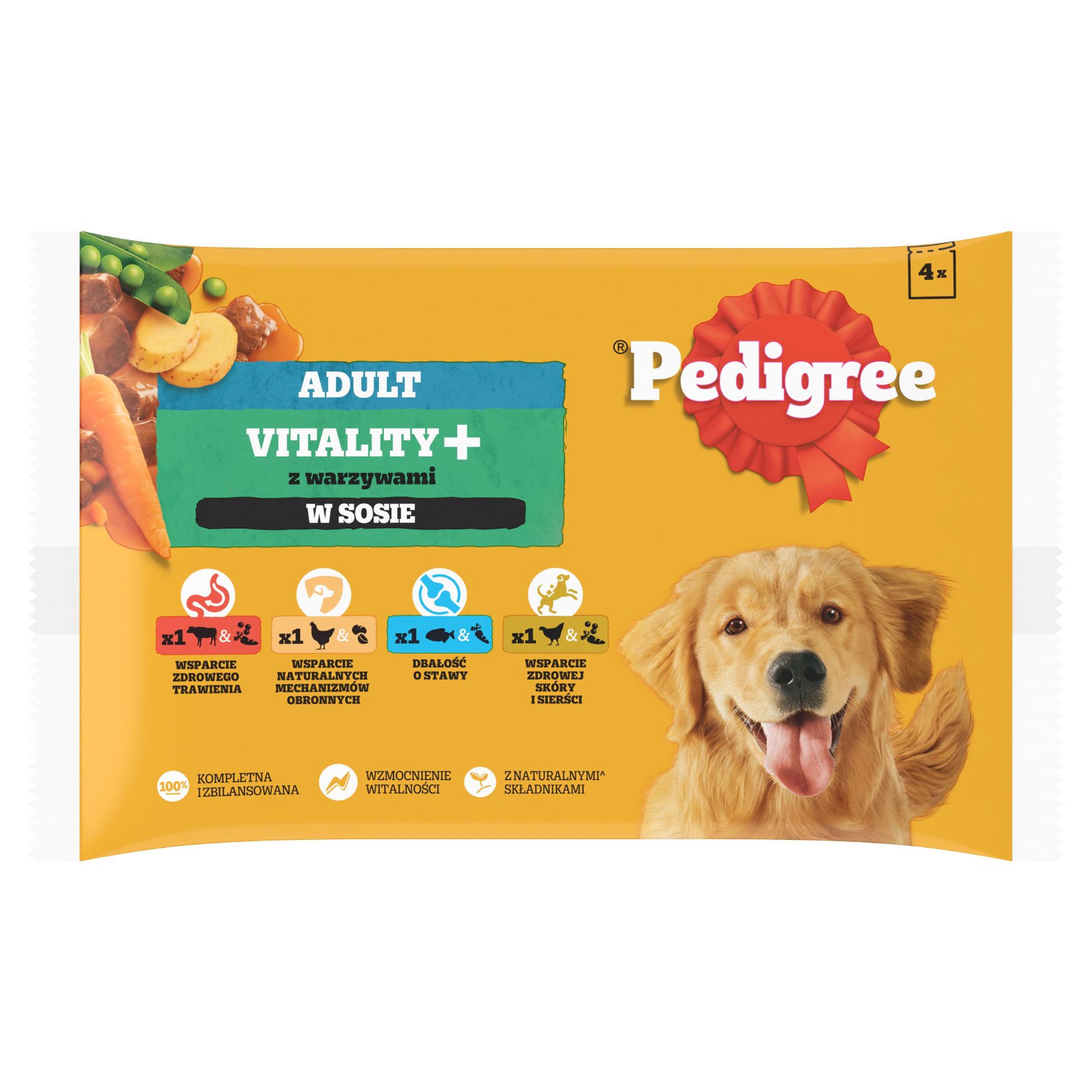Mokra karma PEDIGREE® Adult Vitality+ z warzywami w aksamitnym sosie to pełnoporcjowe pożywienie przeznaczone dla dorosłych psów w czterech wyśmienitych smakach: z wołowiną i wątróbką, marchewką i groszkiem, z kurczakiem i ziemniakami, z rybą i marchewką, z drobiem, marchewką i groszkiem. Receptura opracowana przez lekarzy weterynarii i specjalistów ds. dietetyki z Instytutu Nauki o Zwierzętach WALTHAM™ zawiera glukozaminę, która pomaga w utrzymaniu zdrowych stawów, co sprzyja sprawności ruchowej. Zawarte w składzie witamina E i przeciwutleniacze posiadają właściwości antyoksydacyjne i wspomagają naturalne mechanizmy obronne Twojego psa. Witaminy z grupy B i cynk wspierają zdrową skórę i sierść, aby pomóc Twojemu psu wyglądać i czuć się świetnie. Karma PEDIGREE® zawiera naturalne włókno pokarmowe i prebiotyki, które pomagają utrzymać zdrowe jelita bo każdy pies zasługuje na zdrowy brzuszek.