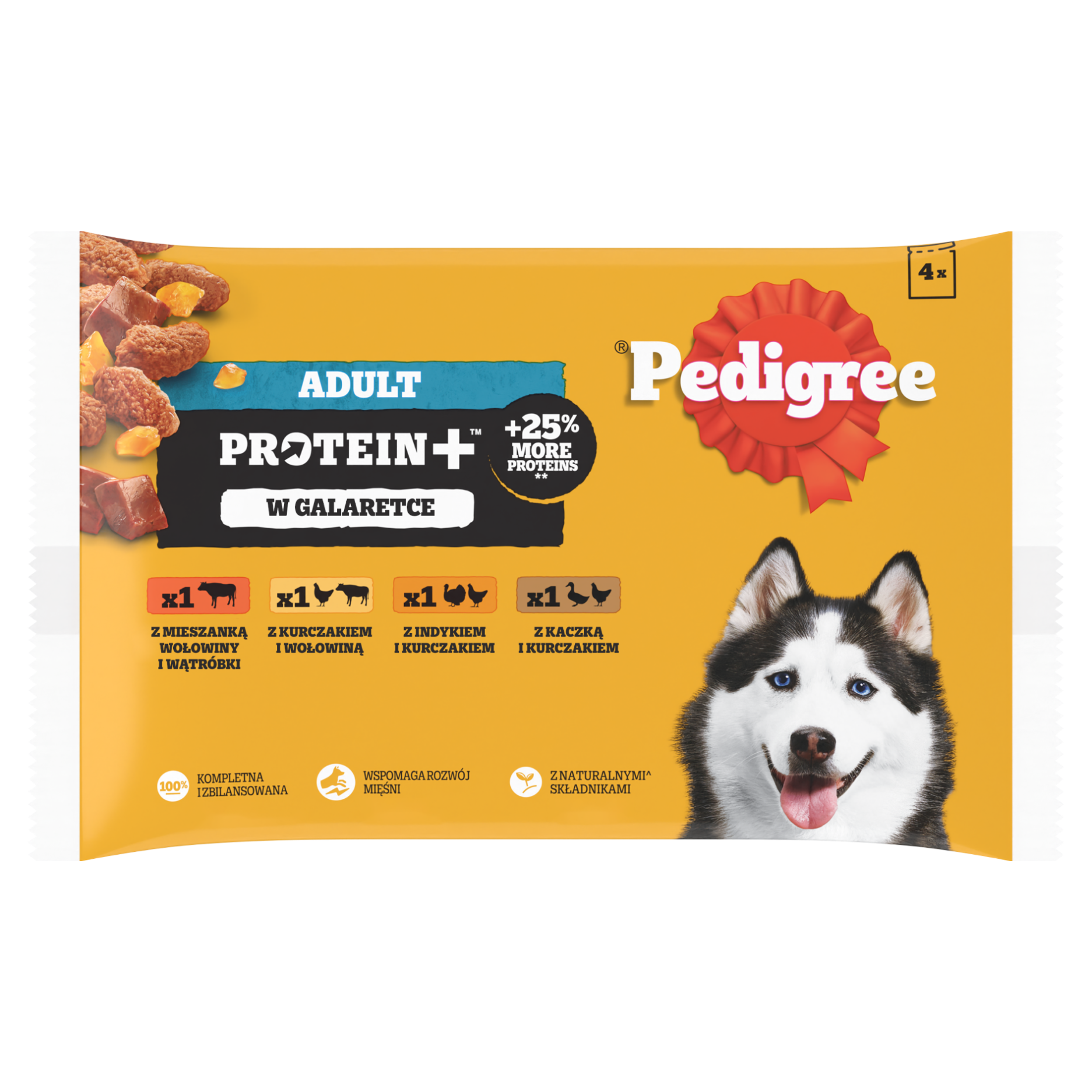 Mokra karma PEDIGREE® Adult Protein+ to pełnoporcjowe pożywienie przeznaczone dla dorosłych psów w czterech wyśmienitych smakach: z mieszanką wołowiny i wątróbki, z kurczakiem i wołowiną, z indykiem i kurczakiem, z kaczką i kurczakiem. W tej kompozycji smaków Twój pupil odkryje delikatne mięsiste kawałki z naturalnymi składnikami w aromatycznej galaretce. Receptura opracowana przez lekarzy weterynarii i specjalistów ds. dietetyki z Instytutu Nauki o Zwierzętach WALTHAM™ zawiera 25% więcej białka w porównaniu z innymi recepturami saszetek PEDIGREE®, dzięki czemu wspiera rozwój mięśni Twojego psa. Podając psu karmę PEDIGREE® będziesz mieć pewność, że zachowa on zdrową energię i dobre samopoczucie.