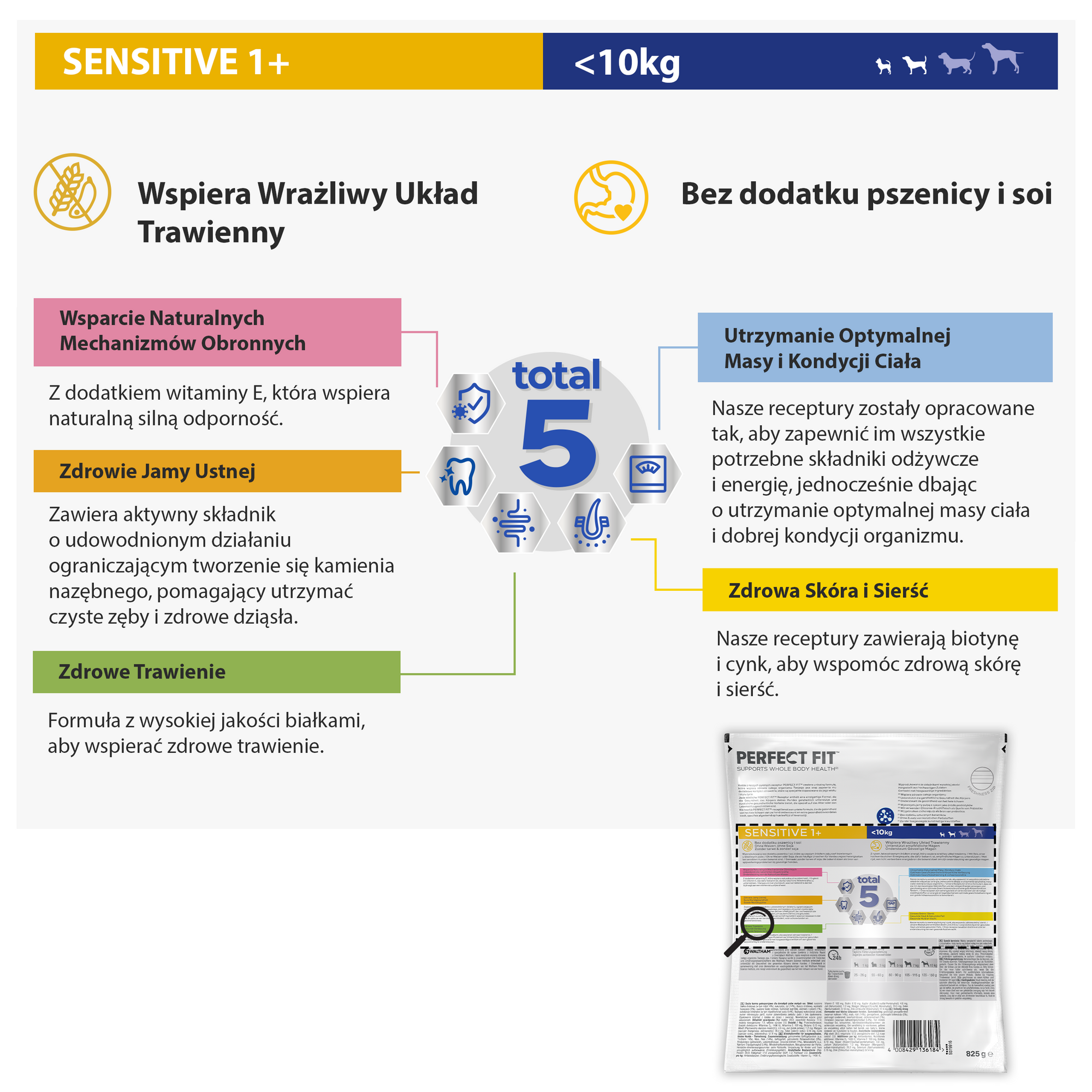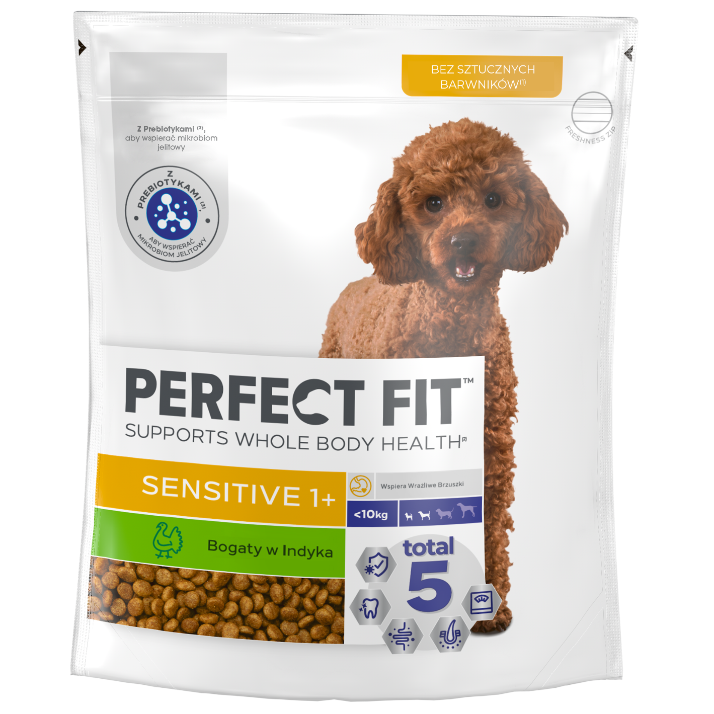 Pyszny pokarm Perfect Fit™ Sensitive 1+ bogaty w indyka zawiera wyjątkową formułę Total 5, która wspiera 5 najważniejszych obszarów zdrowia dorosłego pupila: wspomaga silny układ odpornościowy, zdrowie jamy ustnej, zdrowe trawienie, zdrową skórę i sierść oraz utrzymanie optymalnej kondycji i masy ciała. Receptura Perfect Fit™ Sensitive 1+ została opracowana we współpracy z lekarzami weterynarii oraz specjalistami ds. żywienia z Instytutu Nauki o Zwierzętach WALTHAM™, aby dostarczyć niezbędne składniki odżywcze dorosłym psom z wrażliwym układem trawiennym. Tak jak inne warianty, również pokarm Perfect Fit™ Sensitive 1+ bogaty w indyka dostarcza dodatkowe korzyści: wspiera wrażliwy układ pokarmowy, jest wyprodukowany bez dodatku pszenicy i soi, a także zawiera prebiotyki, aby dbać o mikrobiom jelitowy. Wybierając to pożywienie dla swojego wrażliwego pupila małej rasy, masz pewność, że unikalna formuła Perfect Fit™ wspiera zdrowie całego organizmu Twojego psa oraz zapewnia mu dodatkowe korzyści zdrowotne, które są specjalnie dopasowane do jego wieku i indywidulanych wymagań.