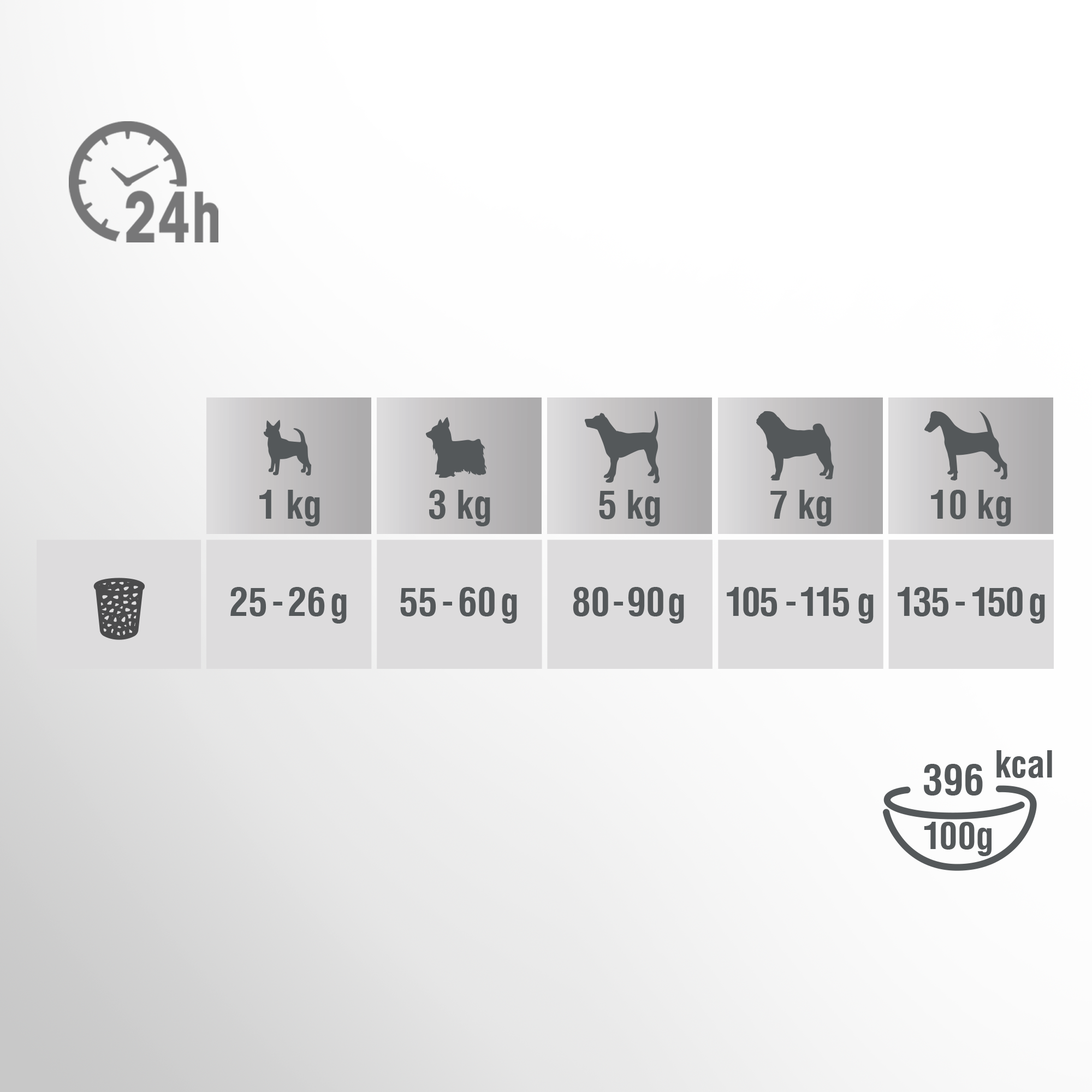 Należy uwzględnić kalorie pochodzące z przysmaków. Ilości karmy są podane wyłącznie jako wskazówki. Należy dostosować ilość karmy do wieku, rozmiaru i poziomu aktywności psa. Przy zmianie diety należy wprowadzać karmę stopniowo.