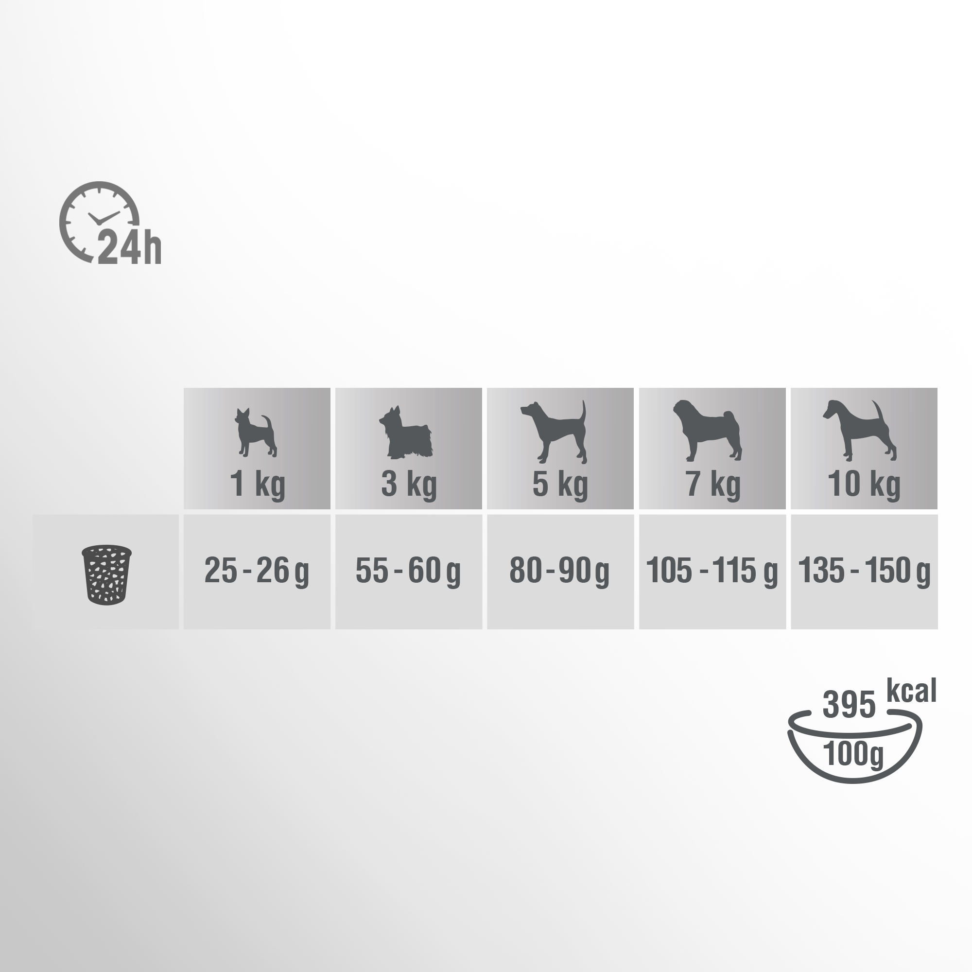 Należy uwzględnić kalorie pochodzące z przysmaków. Ilości karmy są podane wyłącznie jako wskazówki. Należy dostosować ilość karmy do wieku, rozmiaru i poziomu aktywności psa. Przy zmianie diety należy wprowadzać karmę stopniowo.
