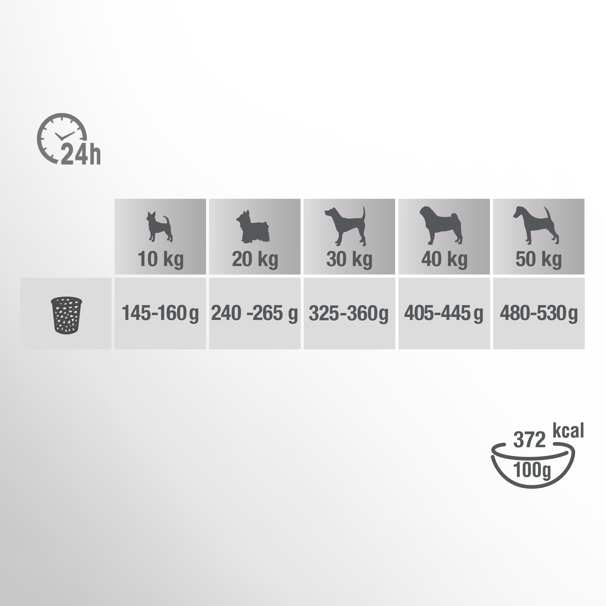 Należy uwzględnić kalorie pochodzące z przysmaków. Ilości karmy są podane wyłącznie jako wskazówki. Należy dostosować ilość karmy do wieku, rozmiaru i poziomu aktywności psa. Przy zmianie diety należy wprowadzać karmę stopniowo.