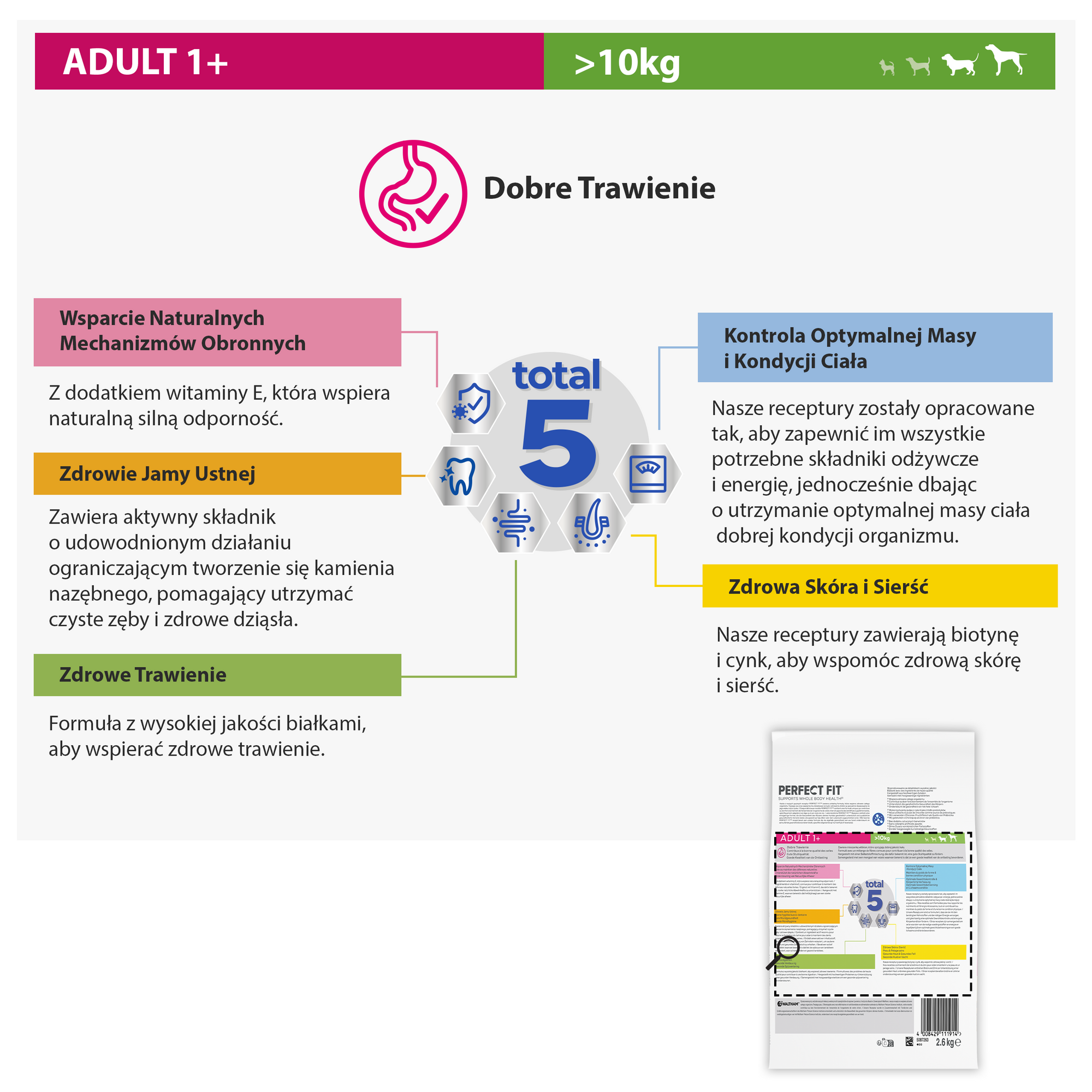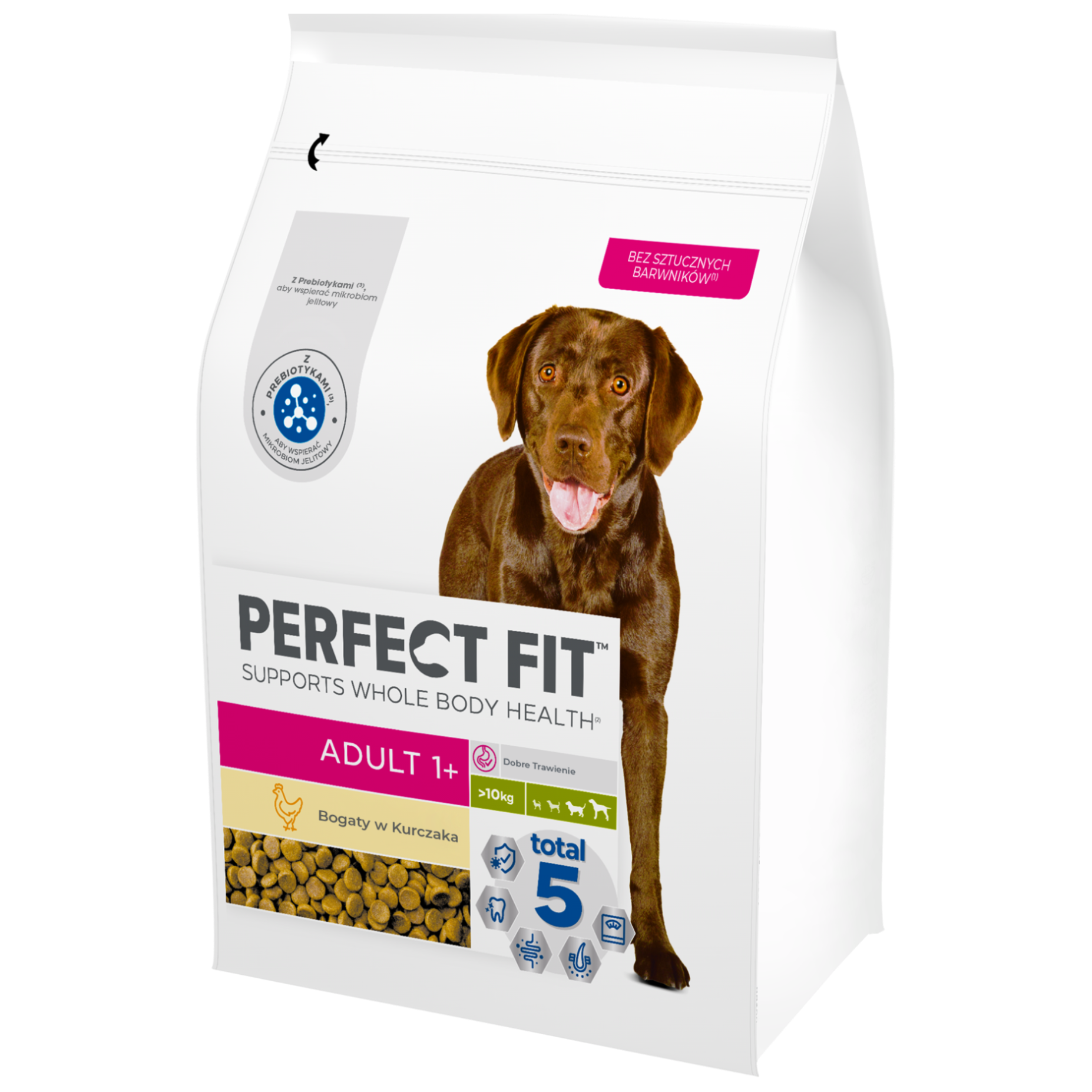 Pyszny pokarm Perfect Fit™ Adult 1+ bogaty w kurczaka zawiera wyjątkową formułę Total 5, która wspiera 5 najważniejszych obszarów zdrowia dorosłego pupila: wspomaga silny układ odpornościowy, zdrowie jamy ustnej, zdrowe trawienie, zdrową skórę i sierść oraz utrzymanie optymalnej kondycji i masy ciała. Receptura Perfect Fit™ Adult 1+ została opracowana we współpracy z lekarzami weterynarii oraz specjalistami ds. żywienia z Instytutu Nauki o Zwierzętach WALTHAM™, aby dostarczyć niezbędne składniki odżywcze dorosłym psom. Tak jak inne warianty, również pokarm Perfect Fit™ Adult 1+ bogaty w kurczaka dostarcza dodatkowe korzyści: wspomaga dobre trawienie dzięki optymalnej mieszance włókien pokarmowych oraz zawiera prebiotyki, aby dbać o mikrobiom jelitowy. Wybierając to pożywienie dla swojego pupila dużej rasy, masz pewność, że unikalna formuła Perfect Fit™ wspiera zdrowie całego organizmu Twojego psa oraz zapewnia mu dodatkowe korzyści zdrowotne, które są specjalnie dopasowane do jego wieku i indywidulanych wymagań.