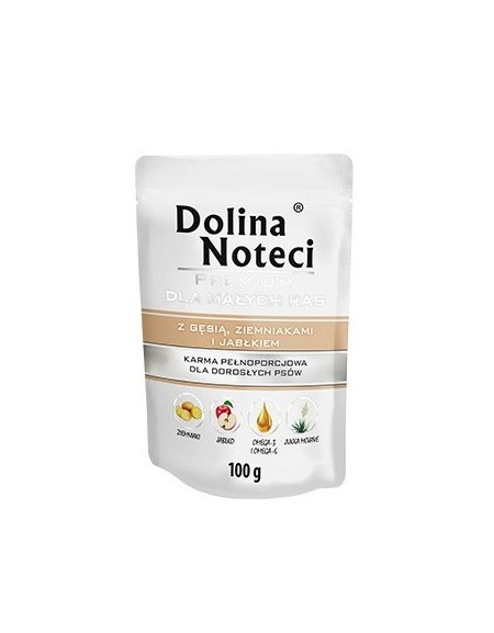 Karma pełnoporcjowa dla dorosłych psów małych ras z gęsią, ziemniakami i jabłkiem marki Dolina Noteci. Aby w pełni zadbać o zdrowie pupila warto podawać mu pełnowartościową karmę. Mięso z gęsi jest bogate w kwasy tłuszczowe n–6, które pozytywnie wpływają na kondycję skóry psa i wygląd jego sierści.