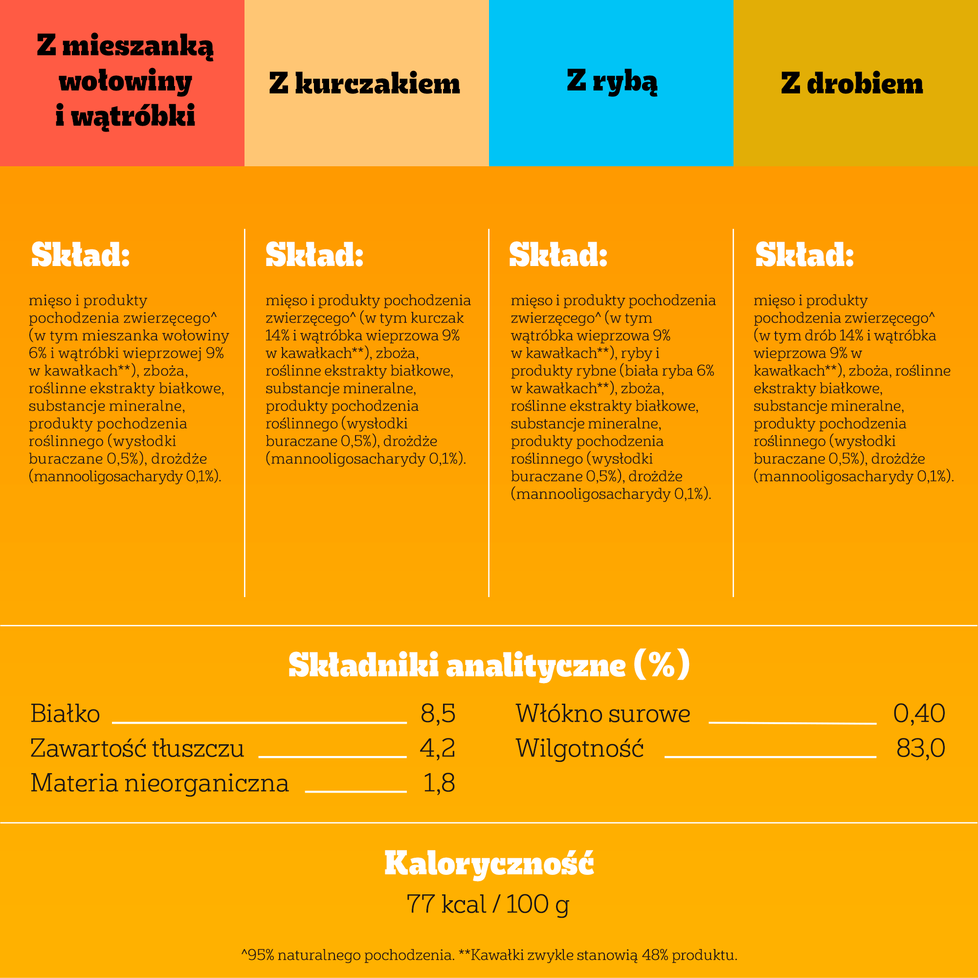 Skład: mięso i produkty pochodzenia zwierzęcego^ (w tym mieszanka wołowiny 6% i wątróbki wieprzowej 9% w kawałkach**), zboża, roślinne ekstrakty białkowe, substancje mineralne, produkty pochodzenia roślinnego (wysłodki buraczane 0,5%), drożdże (mannooligosacharydy 0,1%). ^95% naturalnego pochodzenia. **Kawałki zwykle stanowią 48% produktu.
