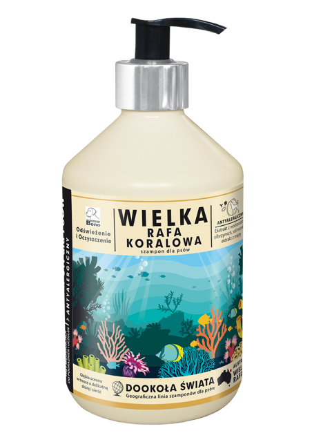 Wielka Rafa koralowa to gama barw, czystość i delikatność. Daje nam ona bogactwo doznań wizualnych, ale jest także bogatym źródłem surowców mineralnych. Głębie morskie dostarczają nam wodorostów oraz sól morską, które zawierają cenne mikro i makroelementy. Kwasy tłuszczowe omega-3 i omega-6, zawarte w wodorostach wspomagają wzrost sierści i włosów, zagęszczają je. Chronią mieszki włosowe przed mikroskopijnymi grzybami i bakteriami co przeciwdziała wypadania włosów. Są źródłem keratyny, co ma zbawienny wpływ na skórę i sierść. Ekstrakt z mięty ma działanie odświeżające, pomaga regulować wydzielanie sebum, dzięki czemu sierść ma piękny blask. Ma działanie przeciwzapalne, dlatego dedykowany jest do skóry wrażliwej i skłonnej do podrażnień. Dodatkowo ekstrakt z mięty łagodzi zaczerwienienia, swędzenie i dyskomfort. Lekka formuła szamponu Wielka Rafa Koralowa oraz zastosowane składniki pochodzące z głębi oceanu dadzą ukojenie psom z alergiami.