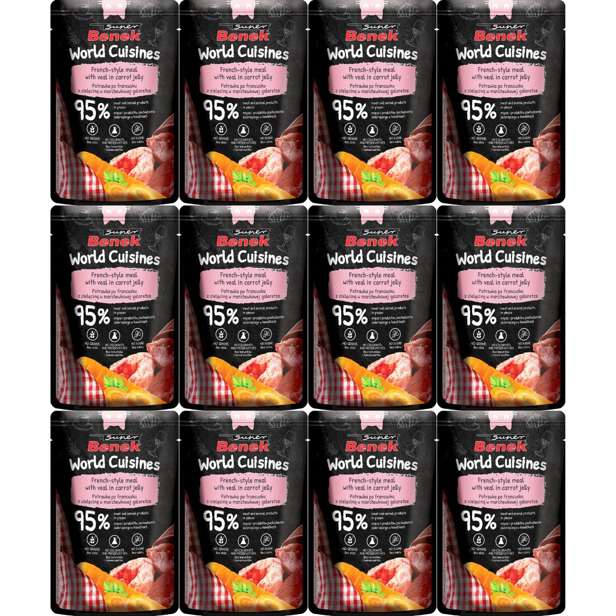 SUPER BENEK World Cuisines Potrawka po Francusku z Cielęciną w Marchewkowej Galaretce to wyjątkowy, bezzbożowy posiłek dla kotów, które zasługują na najlepszą jakość i smak. Ta pełnoporcjowa karma, bogata w aż 95% mięsa, dostarcza kotu wszystkich niezbędnych składników odżywczych, wspierając jego zdrowie i witalność. Delikatna cielęcina, zanurzona w lekkiej, marchewkowej galaretce, nie tylko przyciąga smakiem, ale też wzbogaca dietę o witaminy i antyoksydanty.