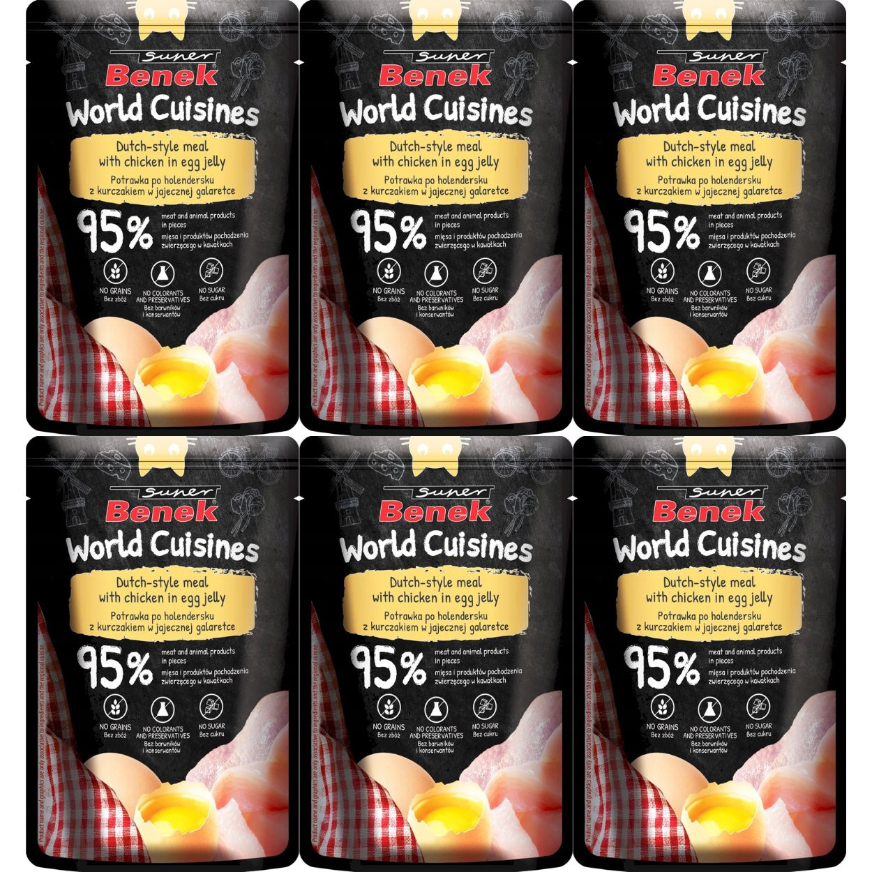 SUPER BENEK World Cuisines Potrawka po Holendersku z Kurczakiem w Jajecznej Galaretce to doskonały wybór dla kocich smakoszy ceniących sobie wysokiej jakości mięso i wyjątkowy smak. Ta pełnoporcjowa karma zawiera aż 95% mięsa, co czyni ją idealną dla kotów o wysokich wymaganiach żywieniowych. Delikatny kurczak w aksamitnej, jajecznej galaretce zapewnia kotu nie tylko wspaniałą ucztę, ale także niezbędne składniki odżywcze.