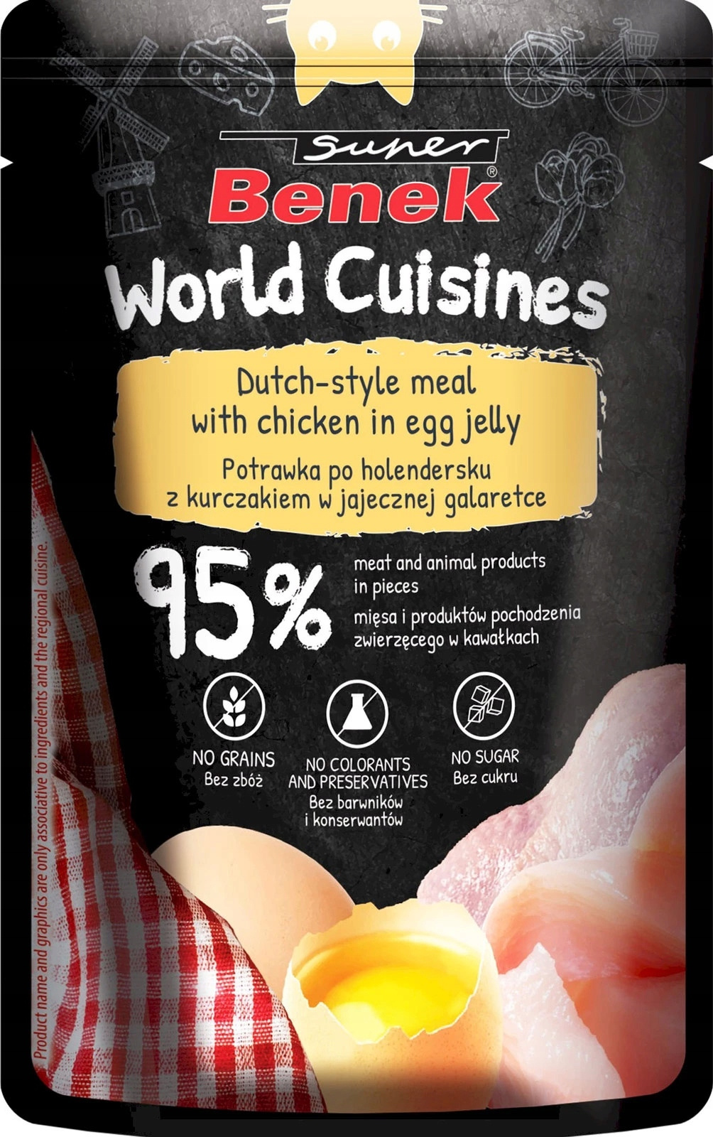 SUPER BENEK World Cuisines Potrawka po Holendersku z Kurczakiem w Jajecznej Galaretce to doskonały wybór dla kocich smakoszy ceniących sobie wysokiej jakości mięso i wyjątkowy smak. Ta pełnoporcjowa karma zawiera aż 95% mięsa, co czyni ją idealną dla kotów o wysokich wymaganiach żywieniowych. Delikatny kurczak w aksamitnej, jajecznej galaretce zapewnia kotu nie tylko wspaniałą ucztę, ale także niezbędne składniki odżywcze.