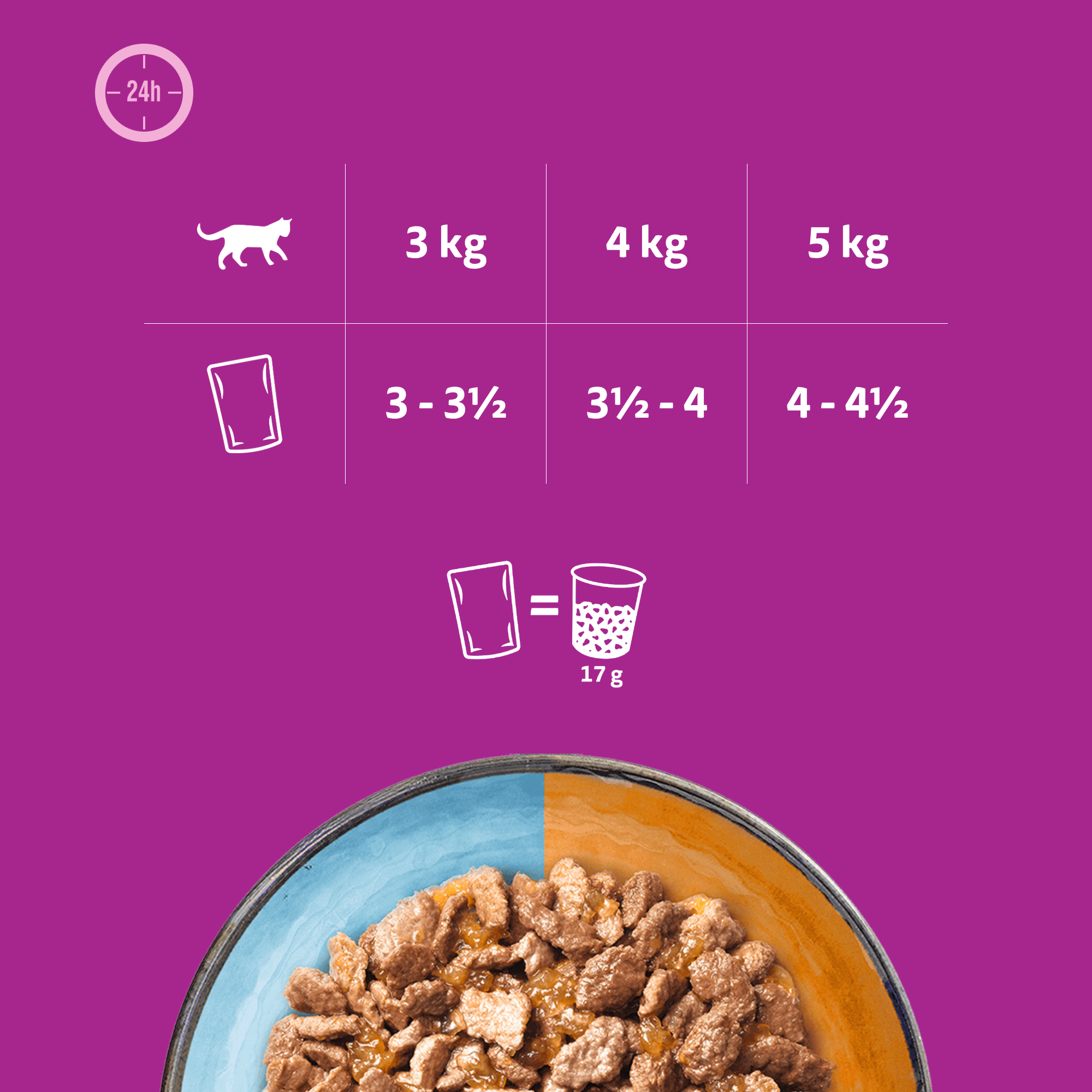 • Kot o masie ciała 3 kg potrzebuje 3-3,5 saszetek karmy mokrej dziennie.