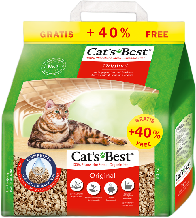 Naturalny, zbrylający się żwirek dla kota, wyprodukowany z czystych włókien roślinnych. Cats Best Original to żwirek, który ulega biodegradacji, można go wyrzucić do kosza z odpadami biologicznymi.Ekologiczny żwirek charakteryzujący się wysoką chłonnością i naturalnym zapachem. Pochłaniający nieprzyjemne zapachy i zapewniający dłuższą świeżość w kuwecie. Naturalny, przyjazny środowisku, ulegający całkowitej biodegradacji, nie zawierający żadnych sztucznych dodatków.Żwirek ten zawiera naturalną pułapkę na zapachy i bakterie. Wilgoć i zapachy szybko są wiązane i zatrzymywane przez mikroskopijne włókna roślinne. Przez długi czas zapobiega to uwalnianiu się zapachów.CAT’S BEST Original to jeden z najbardziej chłonnych żwirków zbrylających na rynku. Naturalna drobna struktura włókien roślinnych powoduje, że może on związać nawet 7-krotnie więcej wody, niż wynosi jego objętość. Jest to superoszczędny i bardzo wydajny żwirek dla kota:  wsad podstawowy wystarcza na 4 do 6 tygodni. Należy tylko regularnie usuwać bryłki i odchody. Wg producenta wystarczy zaledwie 2,1 kg żwirku miesięcznie dla jednego kota.