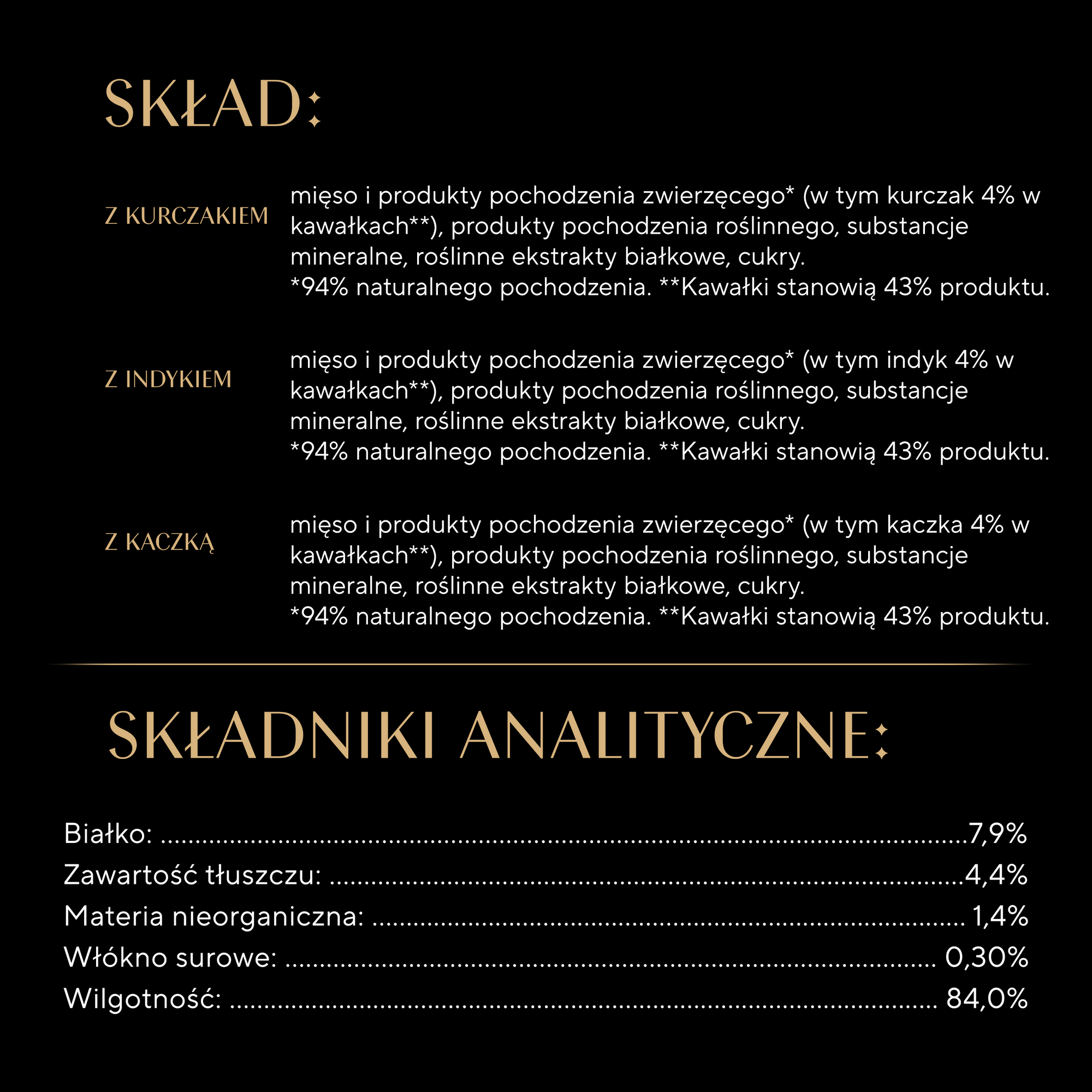 Skład: mięso i produkty pochodzenia zwierzęcego* (w tym kurczak 4% w kawałkach**), produkty pochodzenia roślinnego, substancje mineralne, roślinne ekstrakty białkowe, cukry. *94% naturalnego pochodzenia. **Kawałki stanowią 43% produktu.