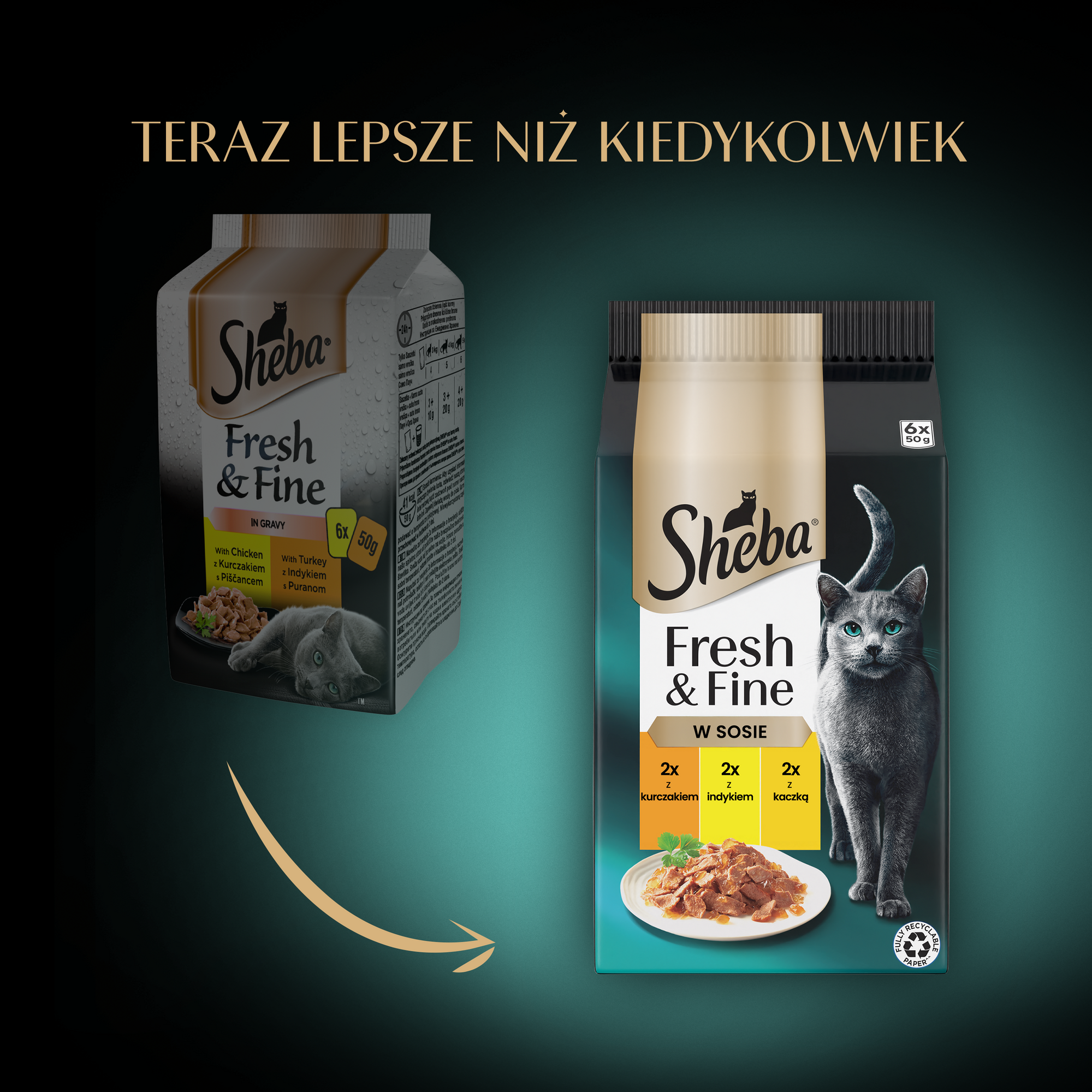 SHEBA® Fresh & Fine to wyśmienity, pełnoporcjowy pokarm dla dorosłych kotów. Pozwól swojemu kotu rozsmakować się w trzech wyjątkowych smakach: z kurczakiem, z indykiem i z kaczką. Zobacz jak Twój koci przyjaciel ucieszy się, gdy podasz mu delikatne kawałki zanurzone w jedwabistym sosie. Receptura zawiera wyłącznie składniki najwyższej jakości. Dzięki temu możesz mieć pewność, że Twój kot otrzymuje wykwintne jedzenie, które dostarczy mu wszystkich niezbędnych składników odżywczych oraz odpowiednią ilość witamin i minerałów.